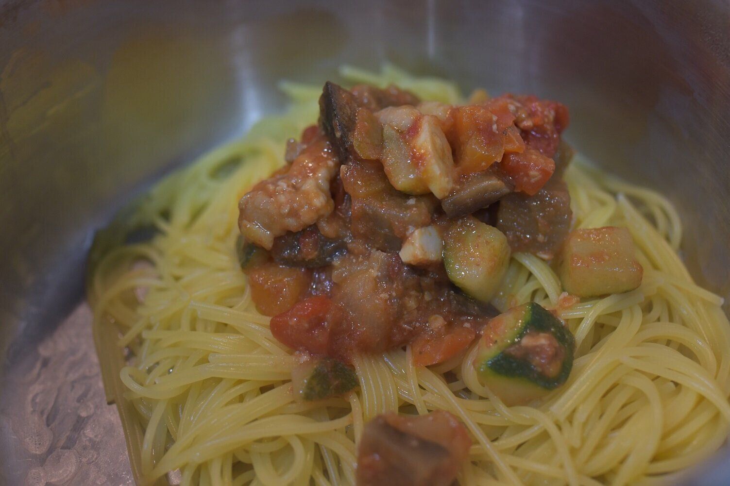 茹でたパスタにからめれば、ラタトゥイユパスタになります。