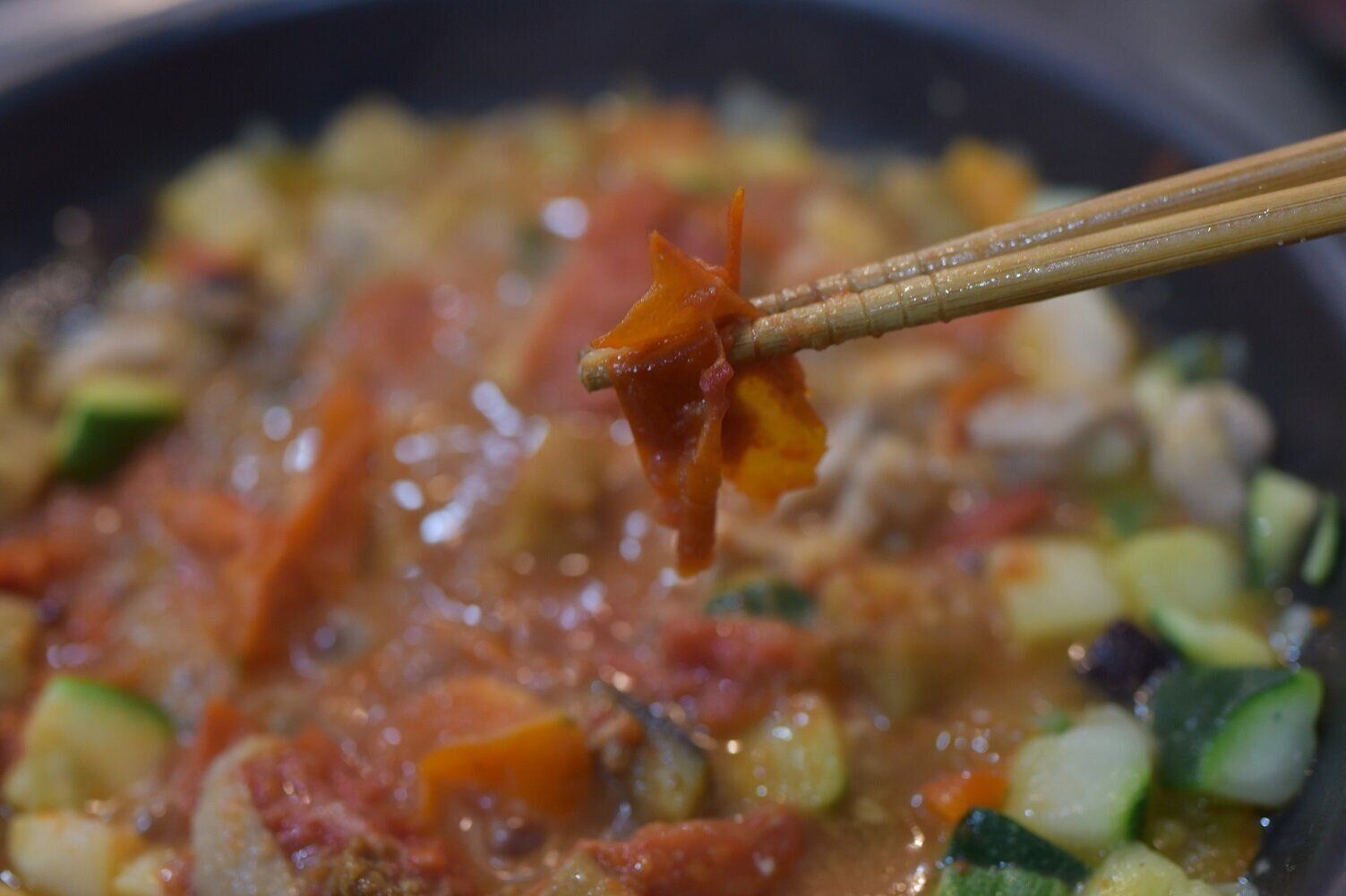 味噌を全体になじませながら煮込みます。煮込んでいるとトマトの皮がむけてきます。口触りが気になる場合は、このタイミングで取り除きましょう。
