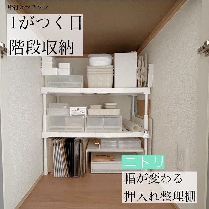 奥行きと高さがある押入れは収納がむずかしく、物をどんどん溜め込みがち。そんな押入れ内の収納にピッタリなのが、「幅が変わる押入れ整理棚(999円)」です。名前のとおり、押入れに合わせて幅を74〜108cmと変えられるアイテム。押入れの広い空間を分けることで、物の出し入れが簡単になります。2段に重ねて収納すれば、収納量がさらにアップ!