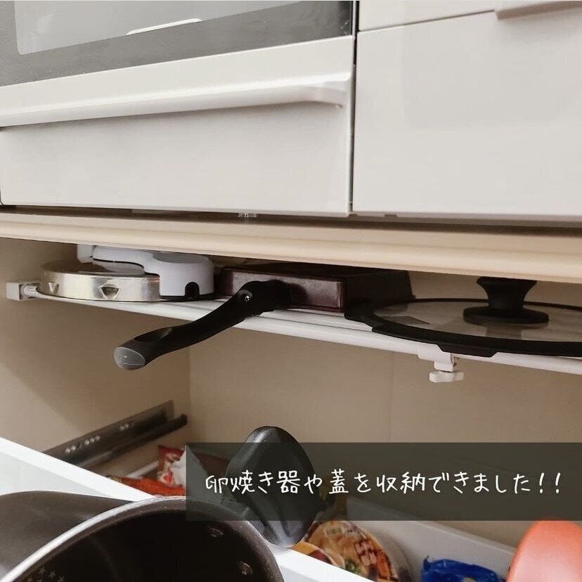 棚がない場所にも収納スペースをつくれる!と人気なのが、「ポールスライド棚(599円)」です。63〜93cmまでの幅に対応し、耐荷重は約10kgと力持ち。コンロ下やクローゼットなどの、上の空間がもったいないデッドスペースに収納場所を増やせる便利なアイテムです。壁を傷つけずに取りつけできるので、賃貸にお住まいのかたにも◎。