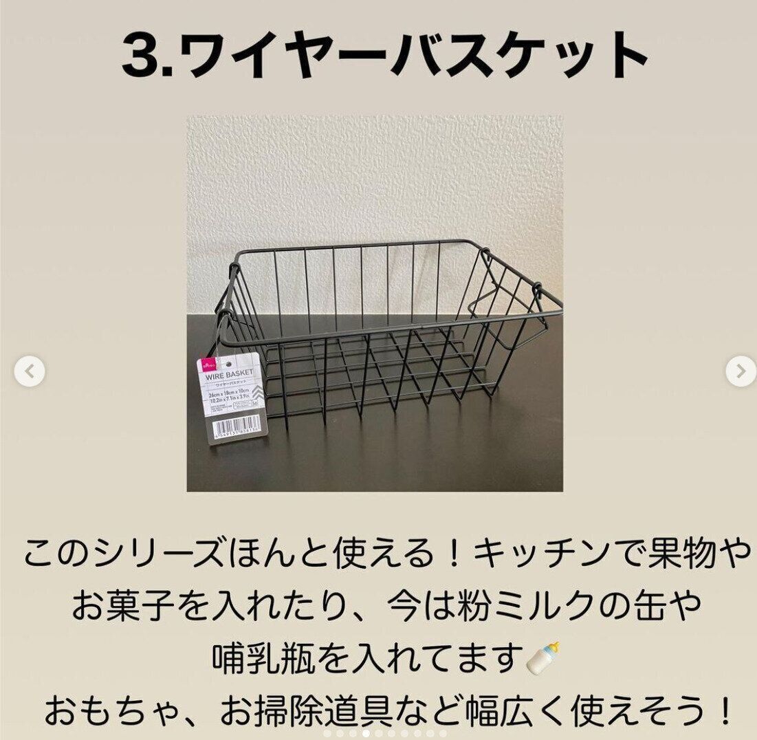 食品のストックやお掃除用具の収納など、用途別に幅広く使える、ダイソーのワイヤーバスケット。その時々に応じて使い分けられるので、場所別に置くのも◎。無造作に入れてもおしゃれ見えするのがポイントで、モノトーンアイテム好きなかたにもおすすめです!