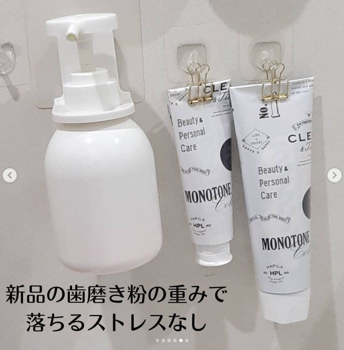 食品の収納や、手帳にはさんでペンホルダーとして、浮かせる収納にも…と幅広く使えるダイソーのリーンクリップ。ムダのないおしゃれなデザインで使いやすく、このようにダイソーの何度でも貼ってはがせるフィルムフックと併用すると、しっかり固定できて便利ですよ。真似したくなる素敵なアイデアです。