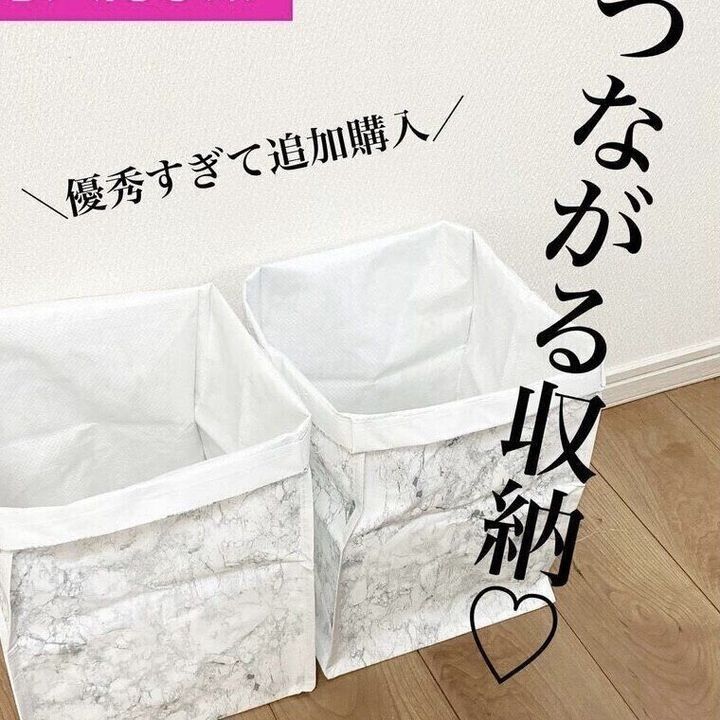 これが110円で買えるなんて、超優秀!とSNSで話題なのが、「ジョイントできるPP収納」です。サイズは大(220円)、小(110円)の2サイズ展開。こちらのすごいところは、内側についたボタンでボックス同士を連結させられるところ。シンプルなデザインとカラーは、どんなお部屋のインテリアともマッチして◎。素材も丈夫でサイズも大きめのため、子ども部屋や押入れ、資源ごみの分別などに使えて便利です。