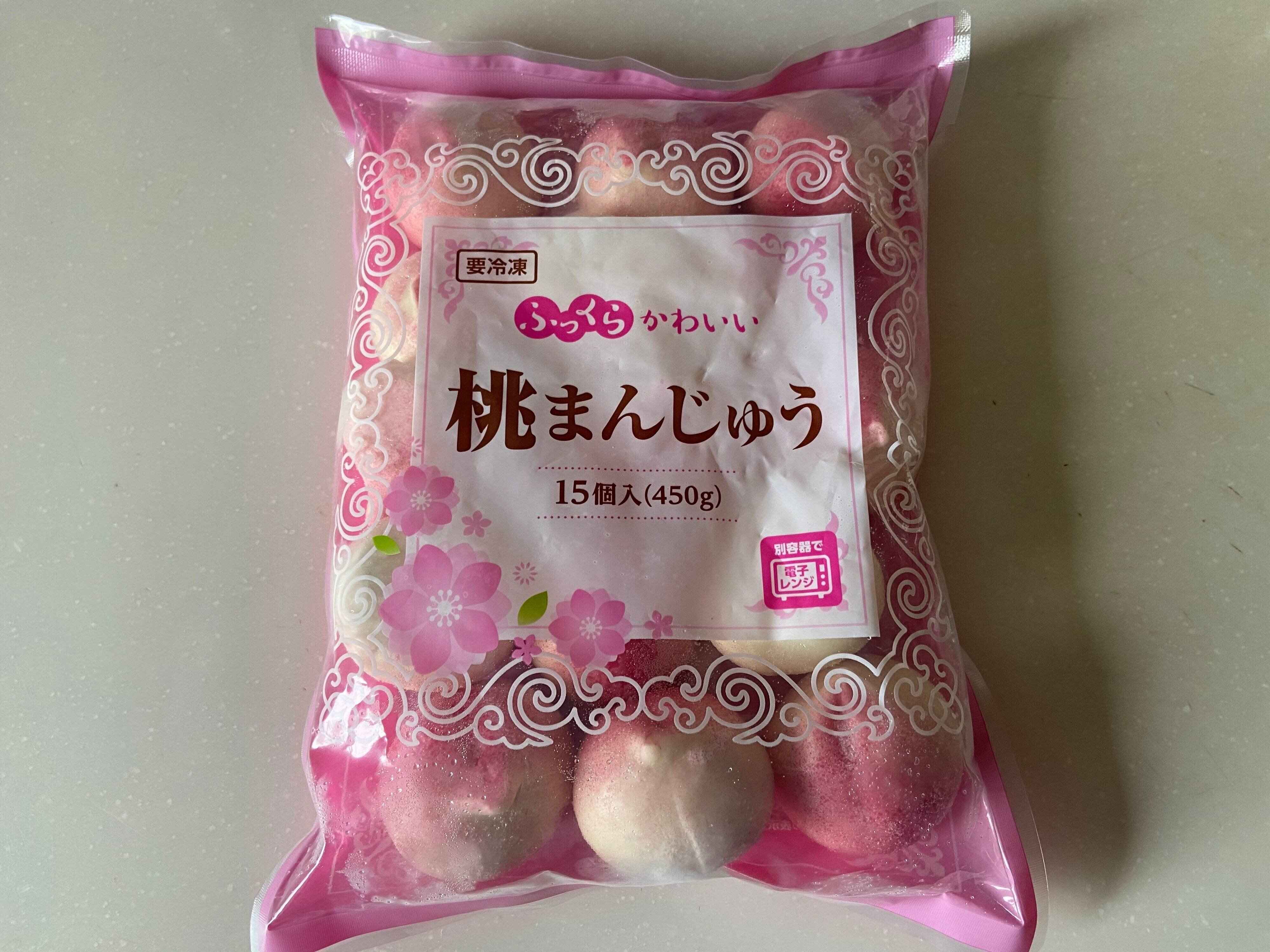 冷凍スイーツコーナーに並んでいた桃まんじゅうですが、ピンク色のパッケージに桃の形をしたミニサイズのおまんじゅうがたくさん入っていて、思わず手に取ってしまった商品です。