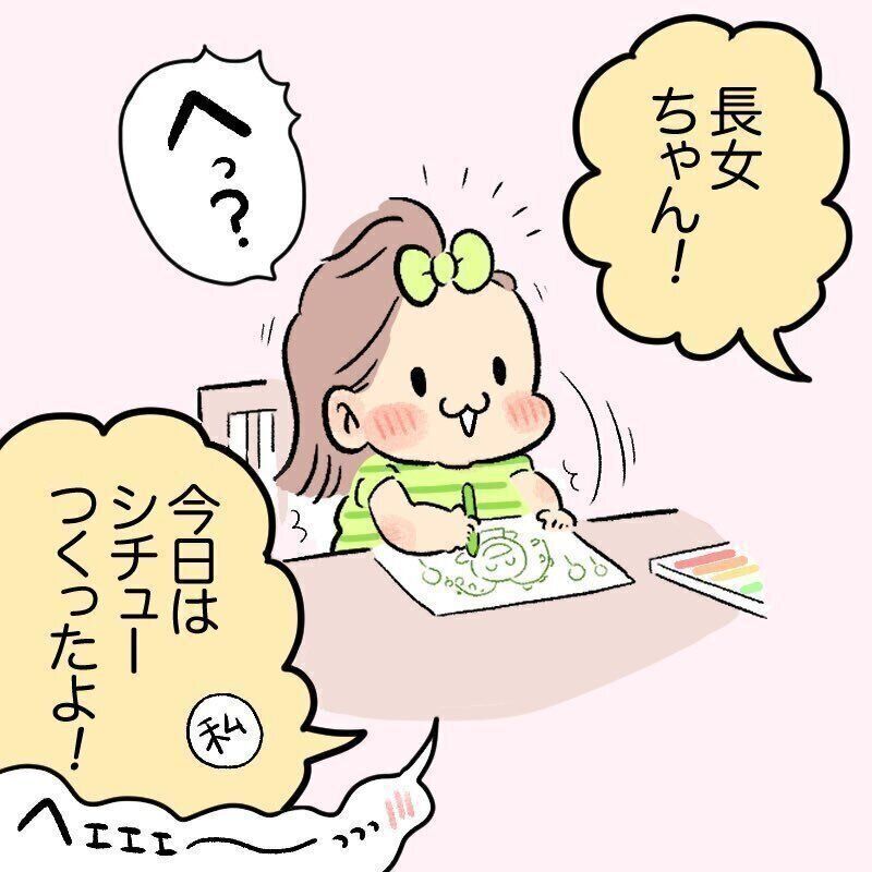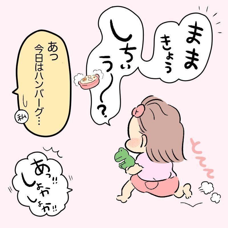 別の日、また同じように今日はシチューかとたずねる長女ちゃん。まいぽーさんがハンバーグと答えると、「あっ‼︎しょかしょか‼︎」の返事。長女ちゃん、よっぽどシチューが食べたいのかな?