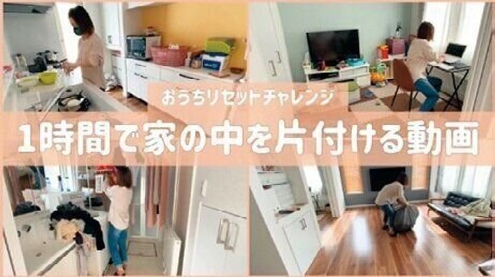 1時間の制限時間を設けて家の中をリセットしていくノーカット動画。スマホで残り時間をカウントダウンしていくことで、家事がゲーム感覚に。てきぱきと動く姿は見ているだけですがすがしい気持ちに。