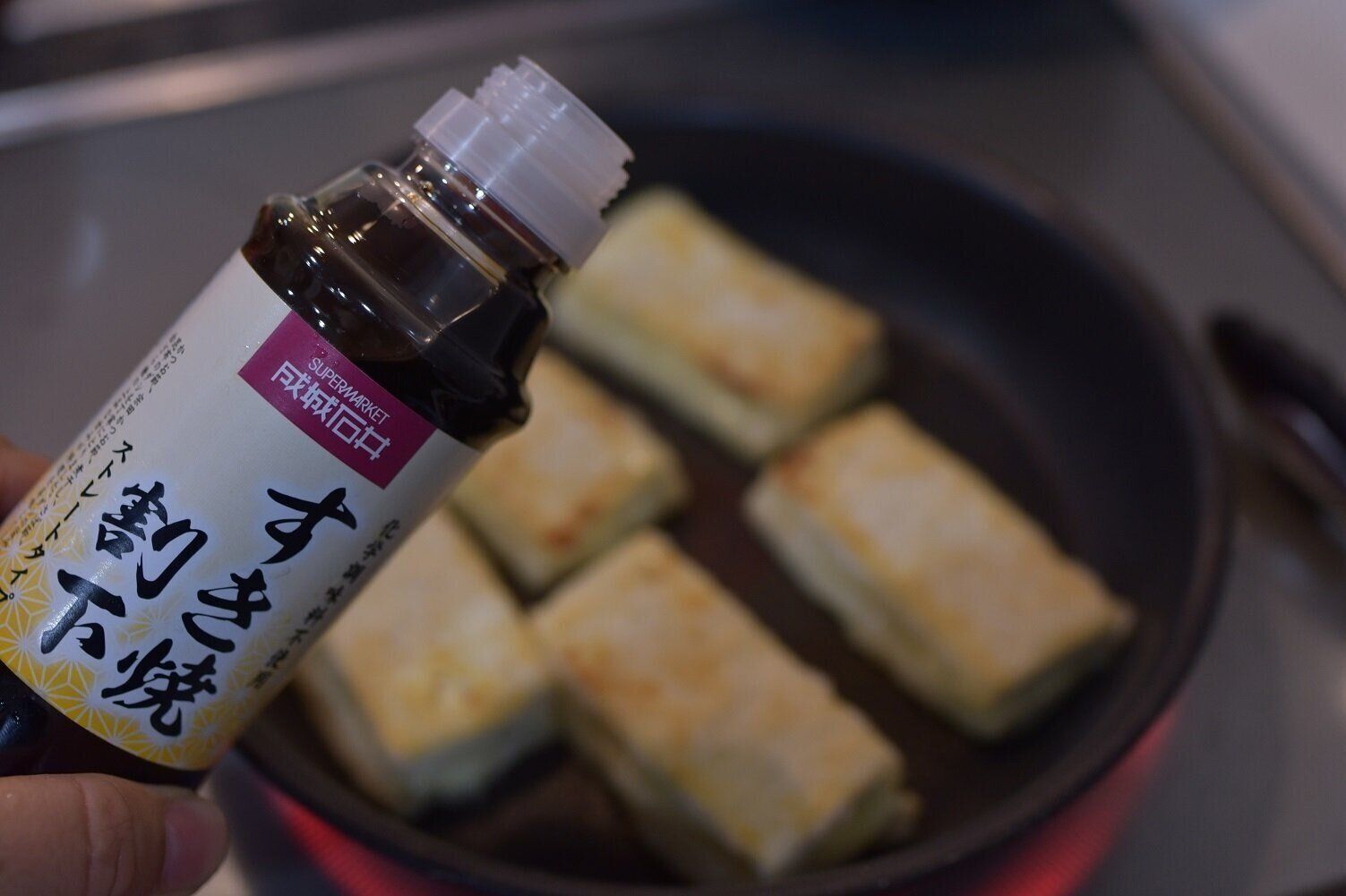豆腐の両面に焼き色がついたら、「すき焼き割下」をかけ入れて、両面にからめたら完成です。