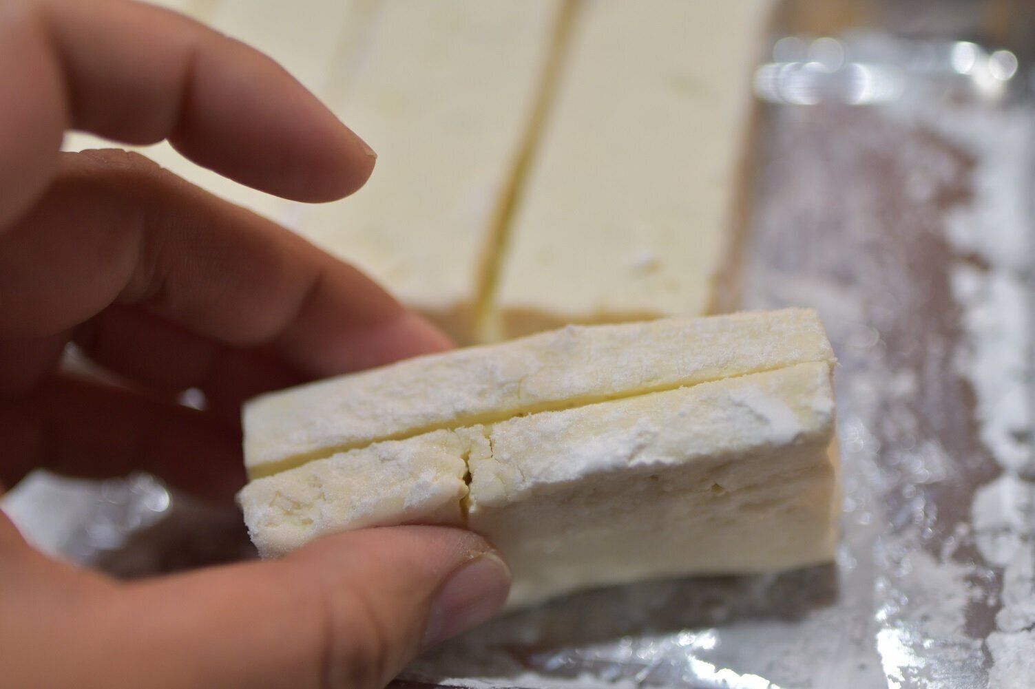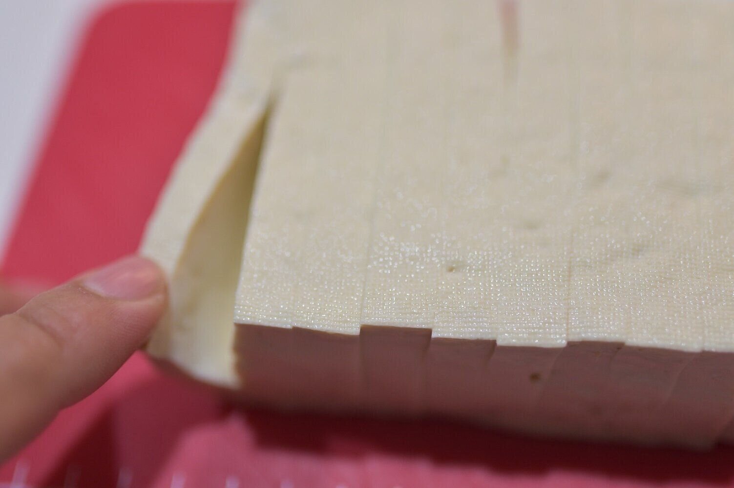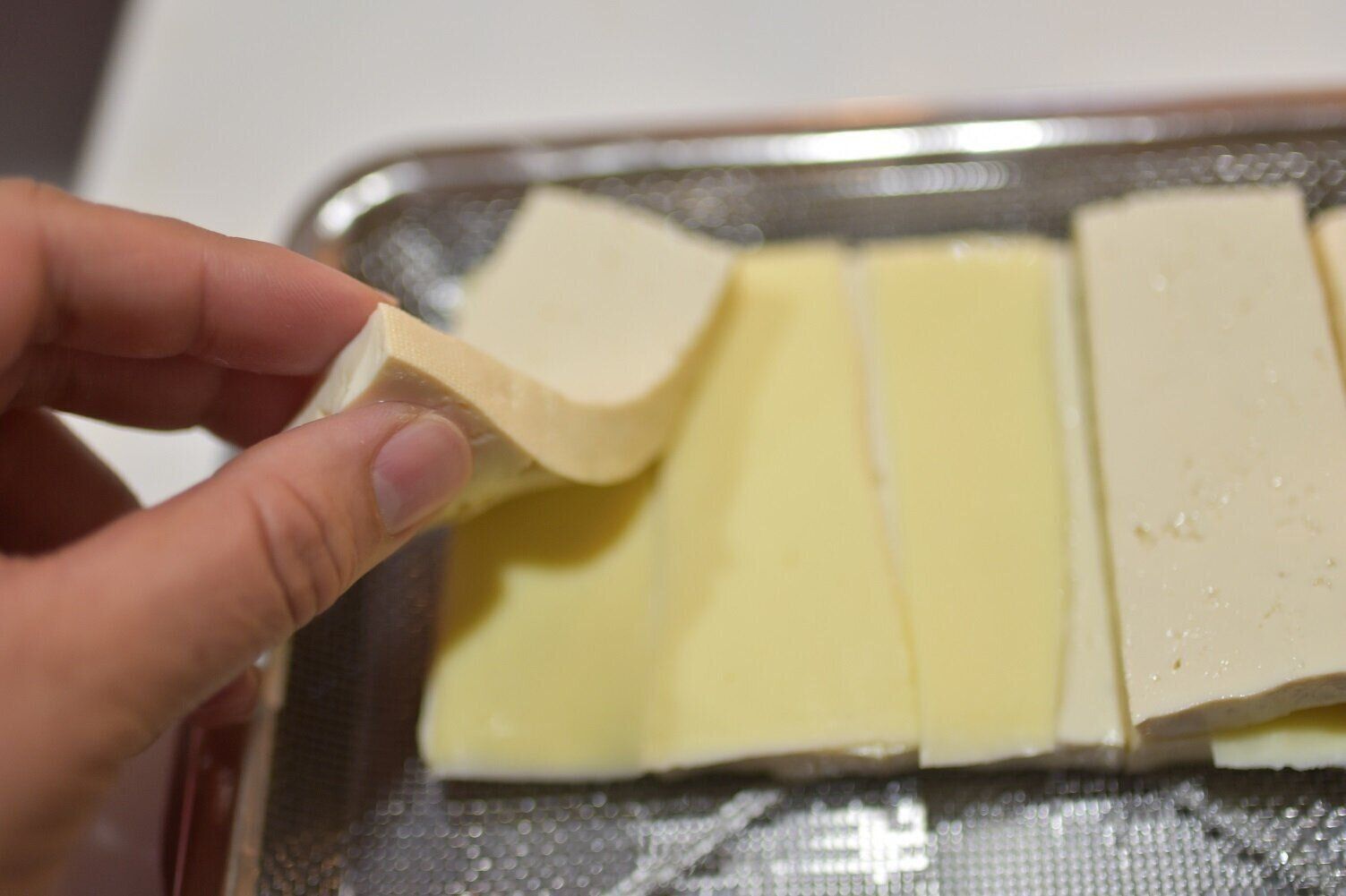 水切りした豆腐を10等分ほどにスライスします(偶数の方が作りやすいです)。