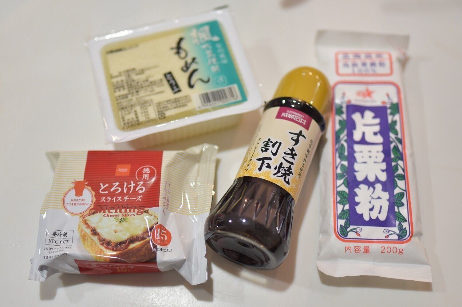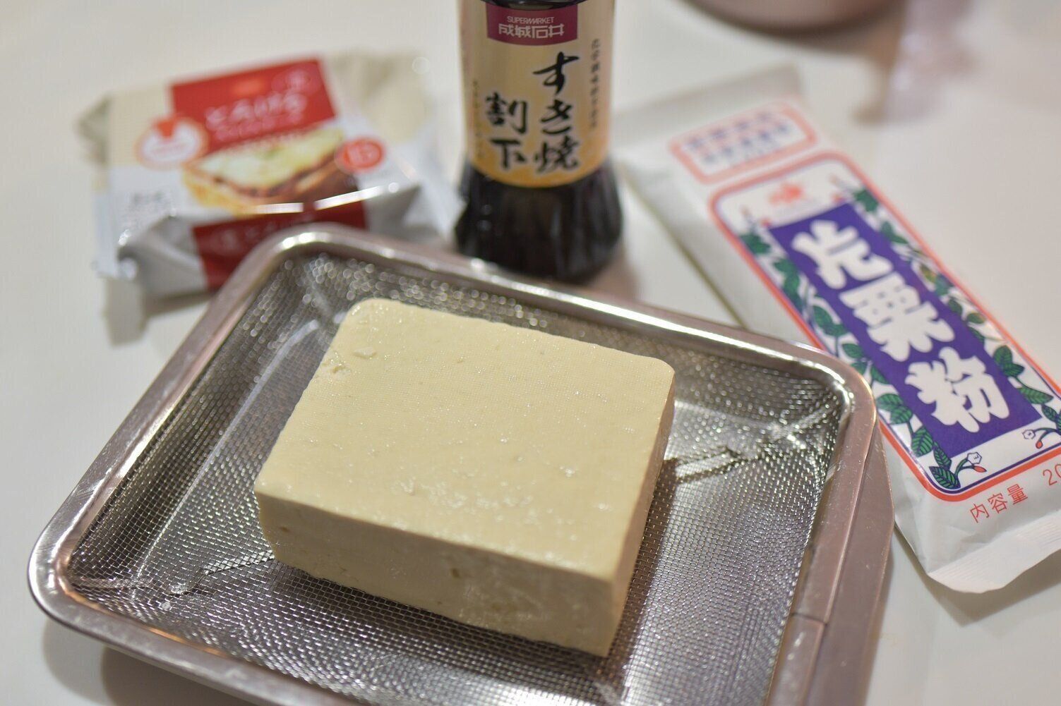 材料は水切りした豆腐と、とろけるタイプのスライスチーズ、片栗粉と成城石井の「すき焼き割下」です。豆腐は形を崩さずに水切りしたいので、ザル等にのせて冷蔵庫で1晩ほど置いてください。