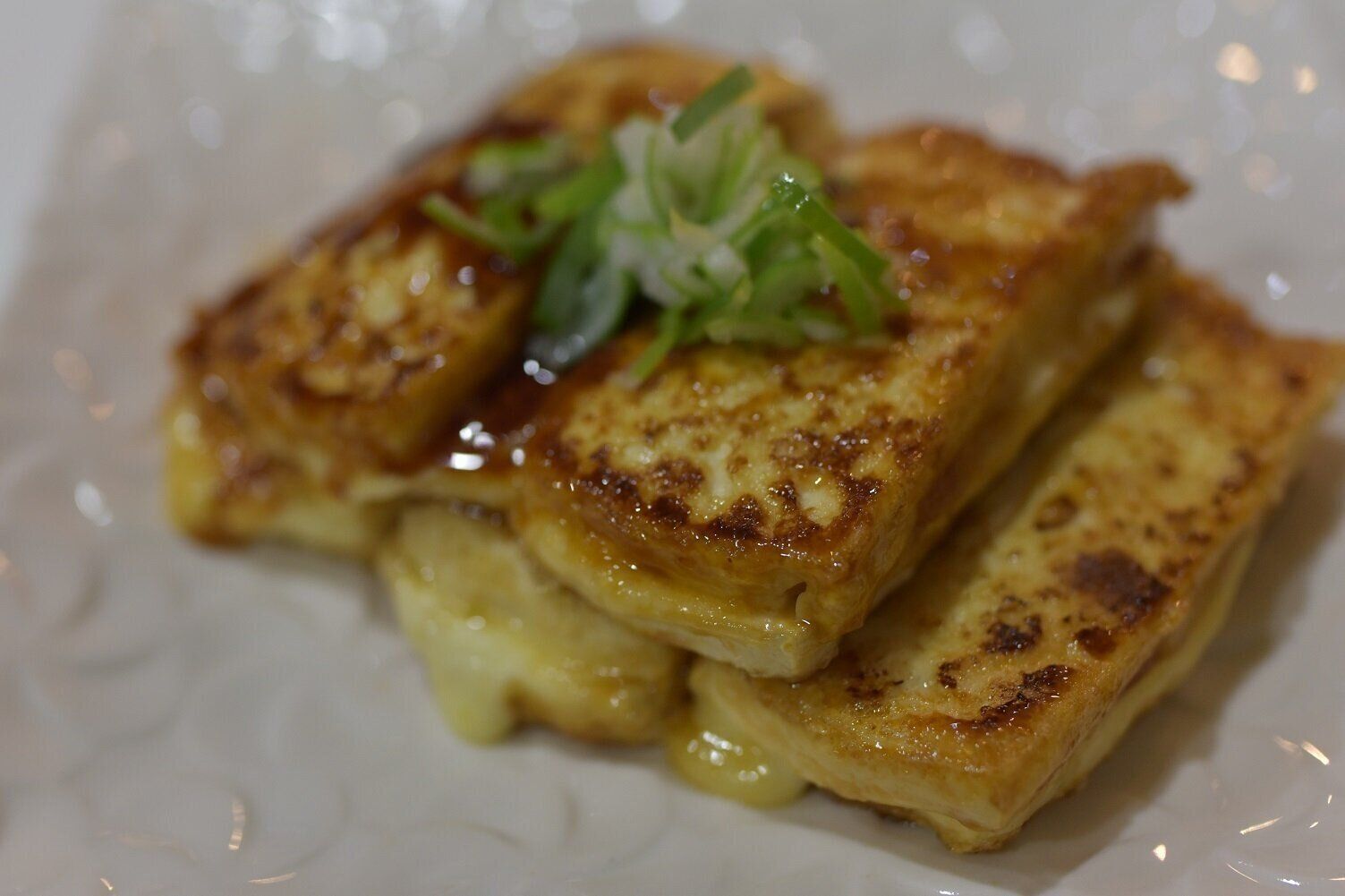 まず紹介するのは「豆腐のステーキ」です。豆腐を切って焼くだけではなく、豆腐と豆腐の間にチーズをはさんでから焼きます。