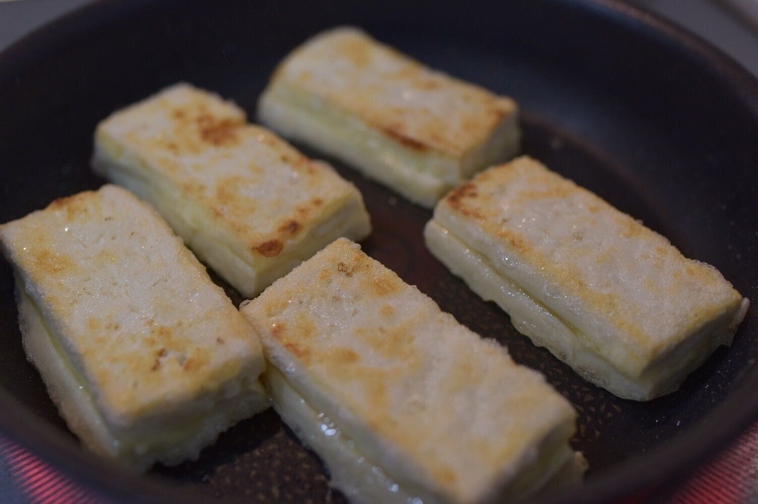 油をひいたフライパンで、両面を焦げ目がつくまで焼きます。蓋をして焼くとチーズが溶けて豆腐と豆腐をくっ付きます。