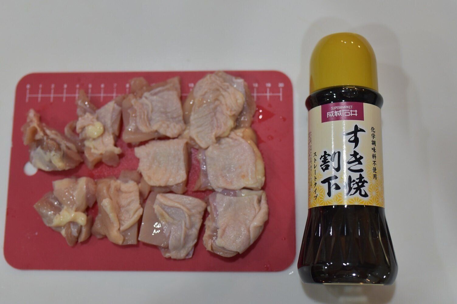 つぎに紹介するのは「鶏肉の照り焼き」です。材料は、一口サイズにカットした鶏もも肉と「すき焼き割下」のみ。