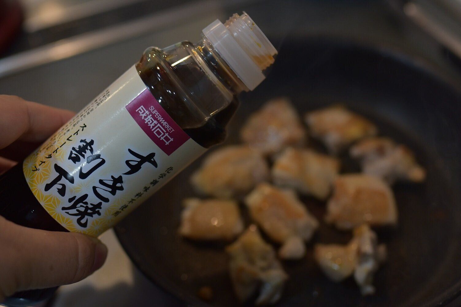 フライパンで鶏もも肉を焼いて、火が通ったら、「すき焼き割下」をかけ入れてまぶしたら完成です。