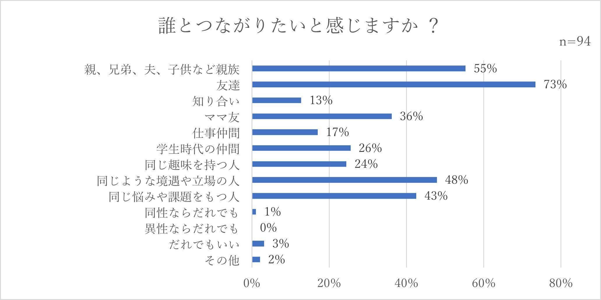 また、子育てだけでなく、仕事や人間関係の悩みや喜怒哀楽を誰かと分かち合いたいという回答も多く見られました。コロナ禍で気軽に呼び出して会えない現状がさらに孤独を深めているようです。