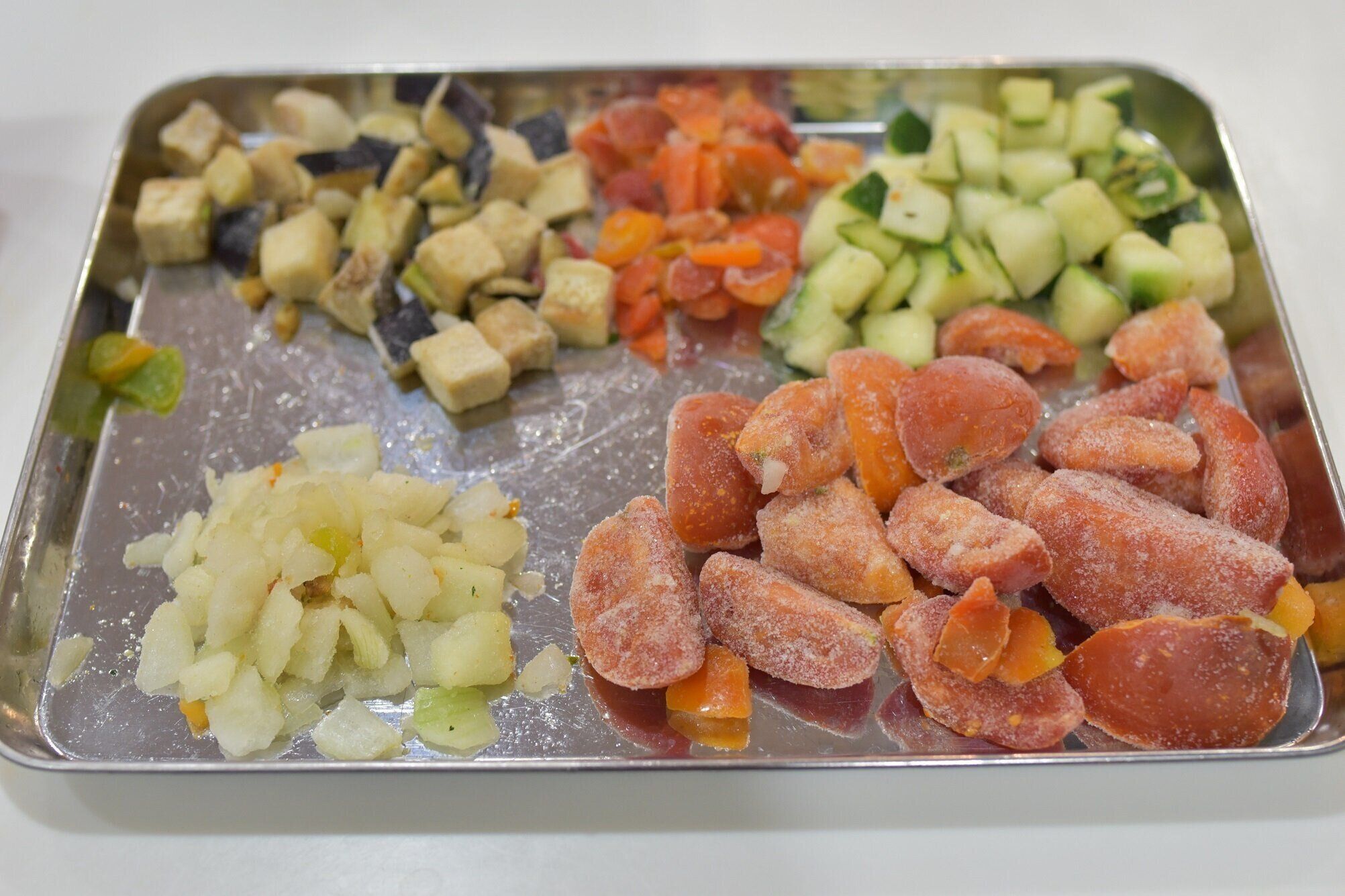ちなみに、6種類の割合のバランスを知りたくて、食材ごとに分けてみたところ、トマトが一番多く、ズッキーニとナスがほぼ同量で2番目に多く、赤パプリカと玉ねぎは少な目、緑パプリカはわずかでした。季節や収穫量によっても割合が変わってくるかもしれませんね。