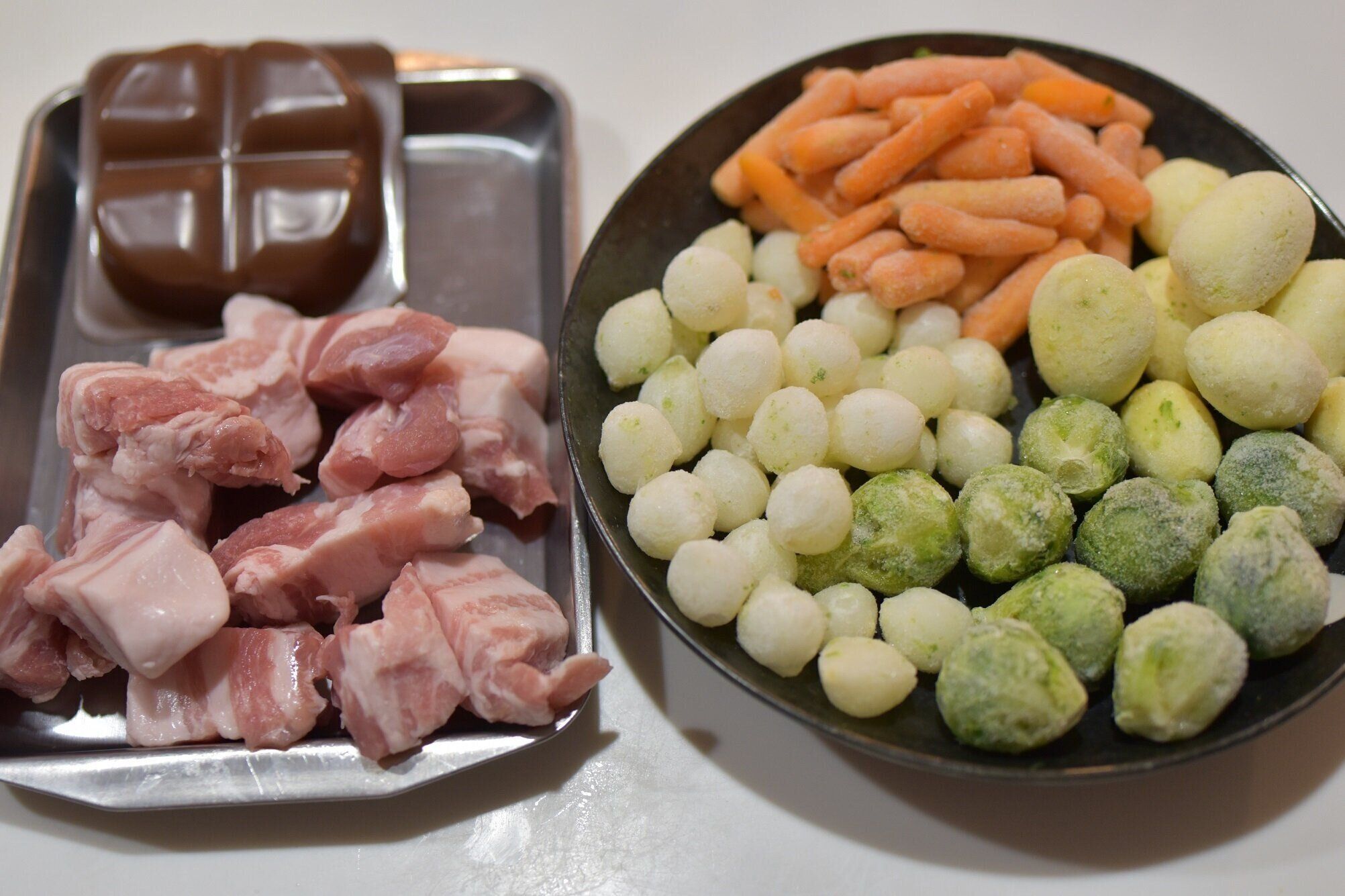 豚肉を炒めて、ヨーロピアン野菜ミックスと水を入れて煮込んで、野菜がやわらかくなったら、カレールウを溶かすのみ。30分ほどででき上がります。