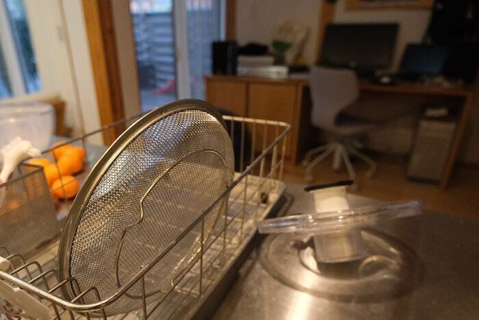 ふつうのザルと違って平たいので、洗い場に置いていてもかなり省スペースです。素晴らしい!