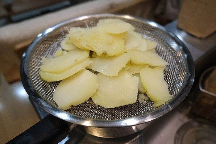 熱湯からあげたばかりのお芋を、平ザルの上で冷ましてみました。先ほど紹介した水を切る、以外にも、食材を冷ます、卵などをこす、生物を干す、などかなり多面的に使用が可能で、とても便利。ザルの底にはちょこんと足がついているので、お皿の上にざるを乗せて、そのまま冷したお蕎麦をいただいているという活用方法もあるんだとか。