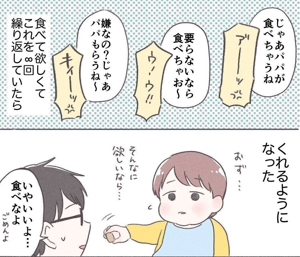 つばめくんにもっと食べてほしくて、この方法を何度も繰り返したパパ。その結果、なんとつばめくんのほうから、パパに食べものをくれるようになったのだとか!やさしいお子さんですね。