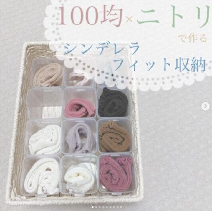 セリアやダイソーで購入できる「くつした整理カップ」のSサイズとがニトリのバスケットにシンデレラフィット!ちょうど12個きれいに入れることができ、靴下もきれいに収納できていますね!