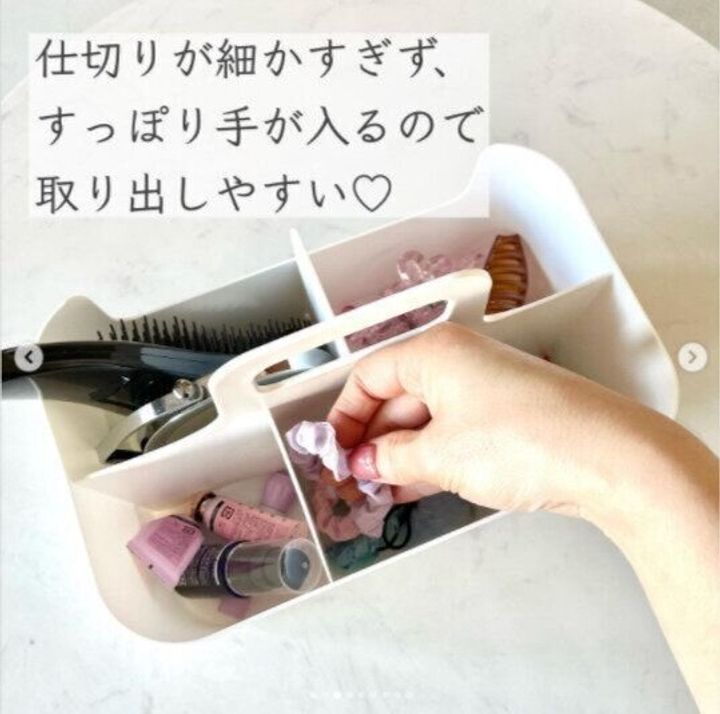 いろいろなものを入れることができる「ハコブNインボックス」。ブラシやこまかいヘアアクセサリーを入れるのにも便利です。仕切りのサイズもちょうどよく、手がすっぽり入るので取り出しやすいそう。持ち運ぶのにも便利ですね!