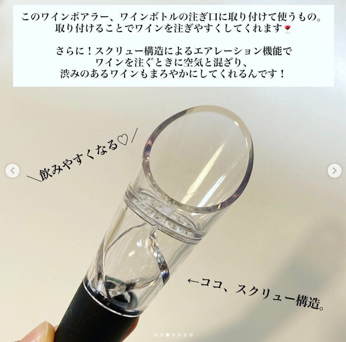 こちらはワインポアラー。こちらをワインボトルの口に装着し、ワインをグラスに注ぎます。一口飲めばわかるはず。スクリュー構造によるエアレーション機能が、空気とワインを程よく混ぜ、ワインがまろやかな味わいに変わります。ちょっと贅沢なひとときにいかがですか。