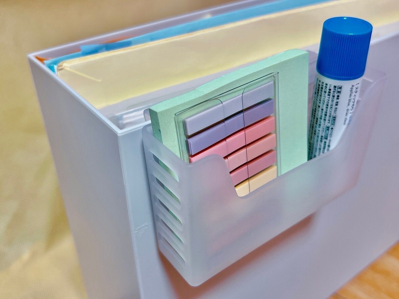 厚さ4mm未満なら引っ掛けられるので、ファイルボックスにもぴったり!デスクの上で散らばってしまいそうな小さな文具を入れておくと探さずにすみます。