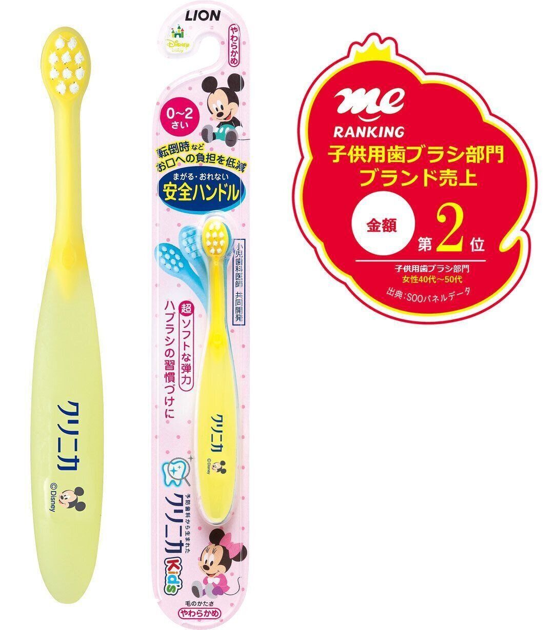 お子さまの歯みがきは「のどをつっついてしまわないかな?」、「歯ぐきを傷つけないかな?」とママやパパは心配ですよね。ライオンの「クリニカKids ハブラシ」は、曲がる・おれない安全ハンドル! 0-2才用は安心してハブラシの習慣づけができる「超ソフトな弾力」、3-5才用はきちんとみがける「ソフトな弾力」と、それぞれのハンドルの弾力を変えています。安全・安心+お子さまの適切なオーラルケアを同時に考えている素晴らしい商品です! 多くのかたに支持(金額2位)されているのも納得ですね。初めてのキッズ歯ブラシにおすすめです。