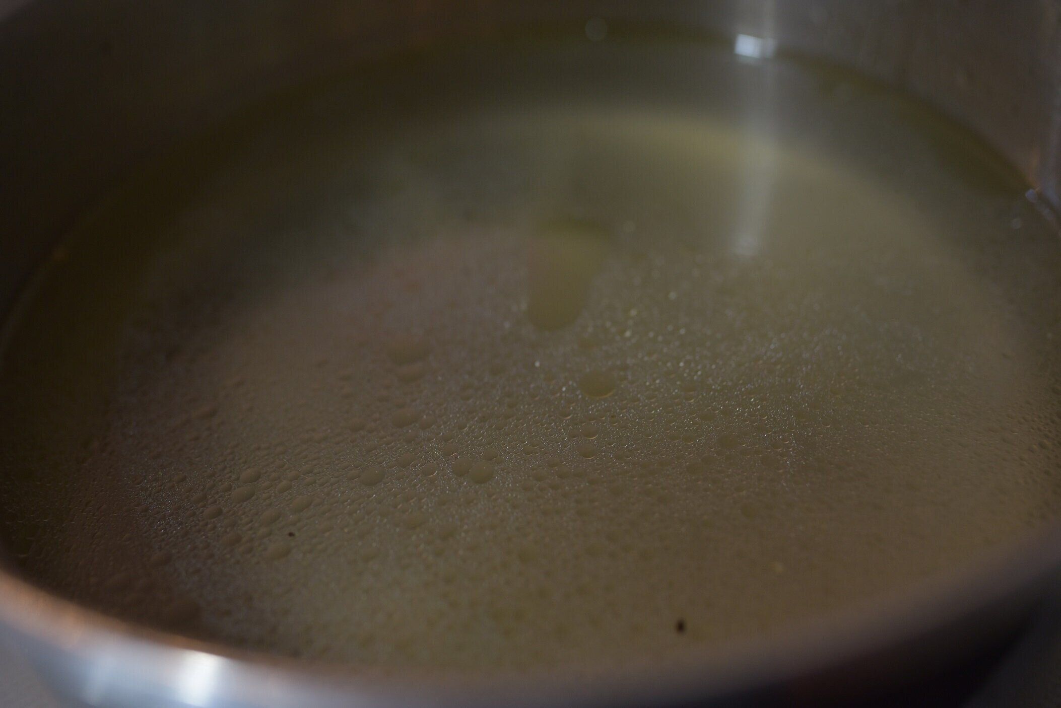 その理由が写真にもあるとおり……油です(揚げなすをゆでたあとのお湯の写真です)。揚げなすなので油をまとっているのは当たり前なのですが、下ゆでせずに煮込んだりすると油感がありすぎる料理になってしまう場合があります。