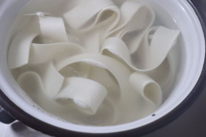 麺を茹でます。ポイントは、沸騰したお湯に1枚ずつ加えること。まとめて加えてしまうとくっついてしまうので注意してください。
