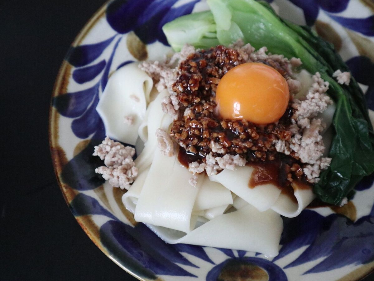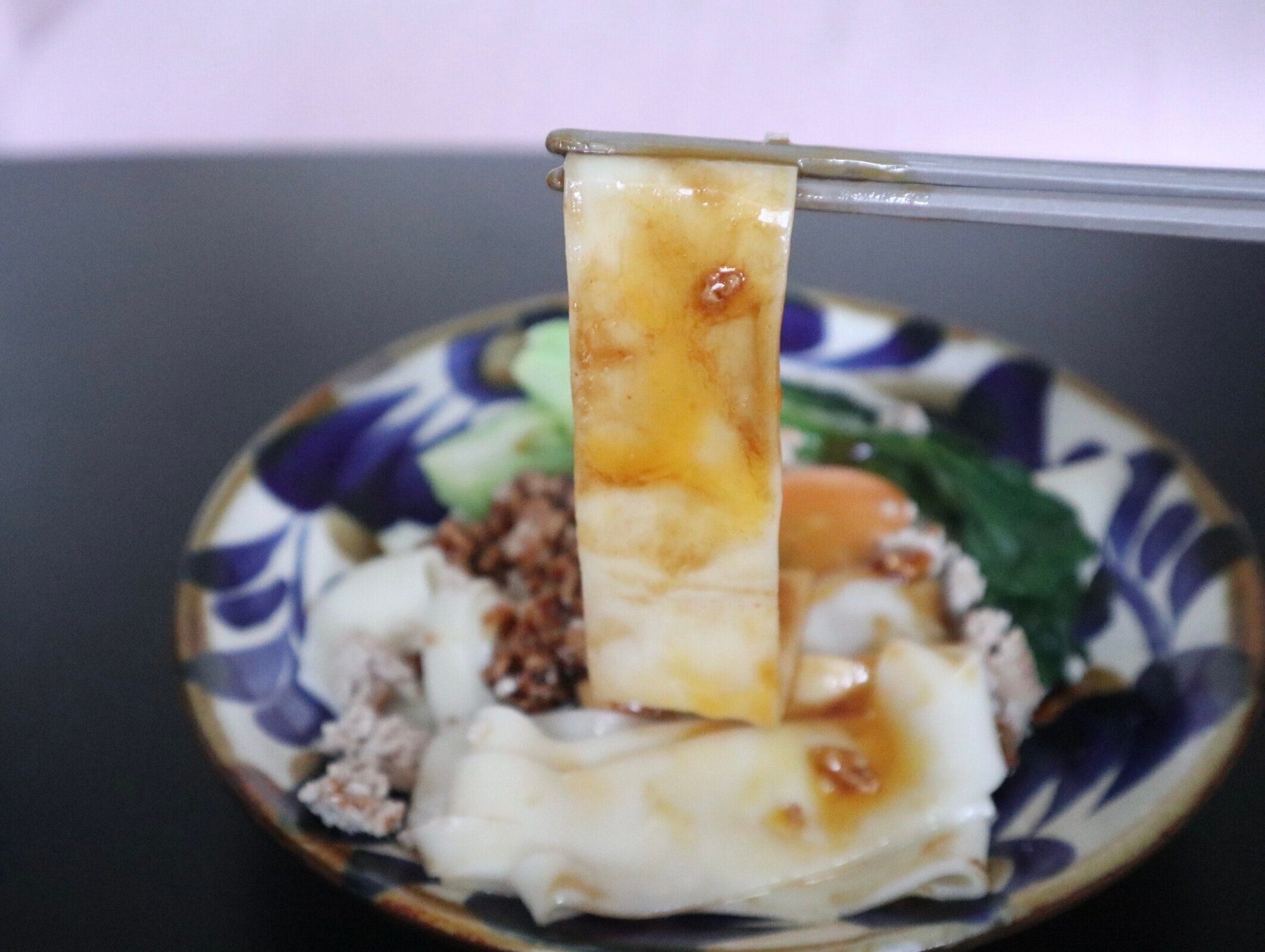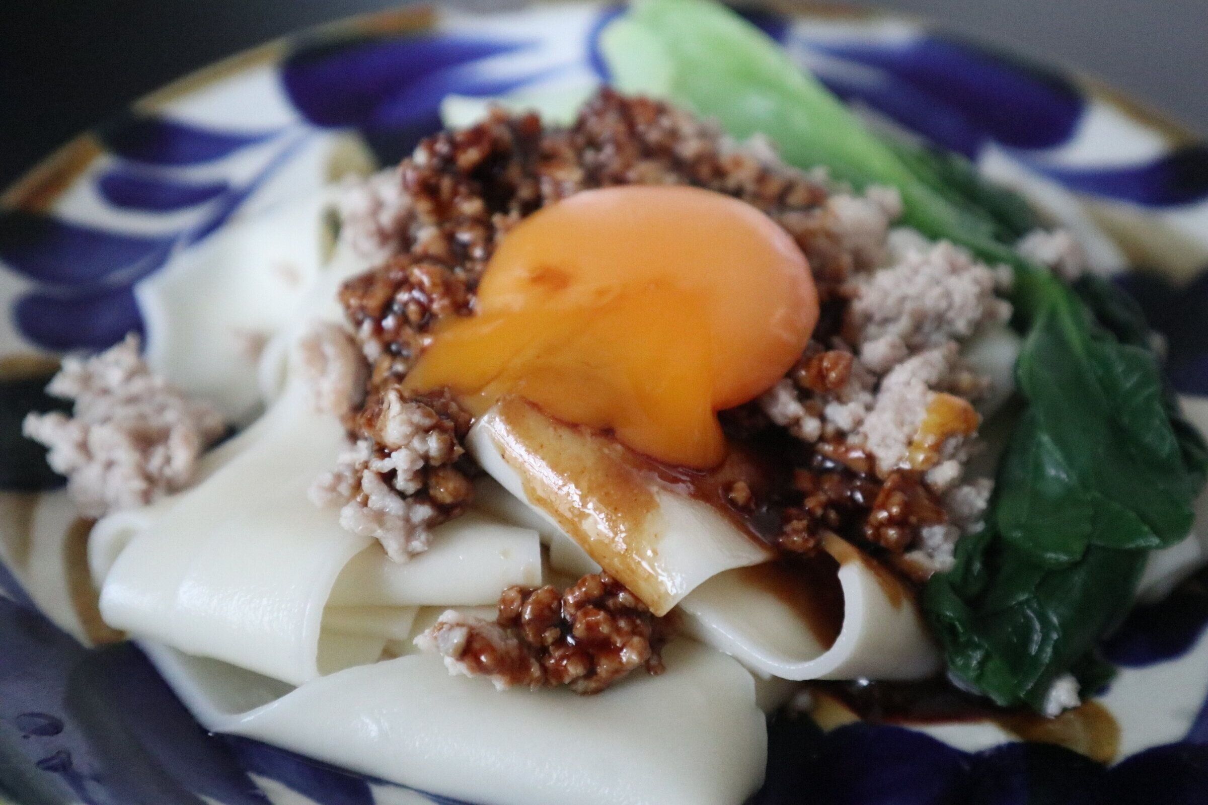 見た目通り生地はもちもちでツルツルした食感です。そこに花椒の香りとオイスターの旨味たっぷりなソースとそぼろがからみクセになる味わいです。卵黄のまろやかさもいい仕事しています。