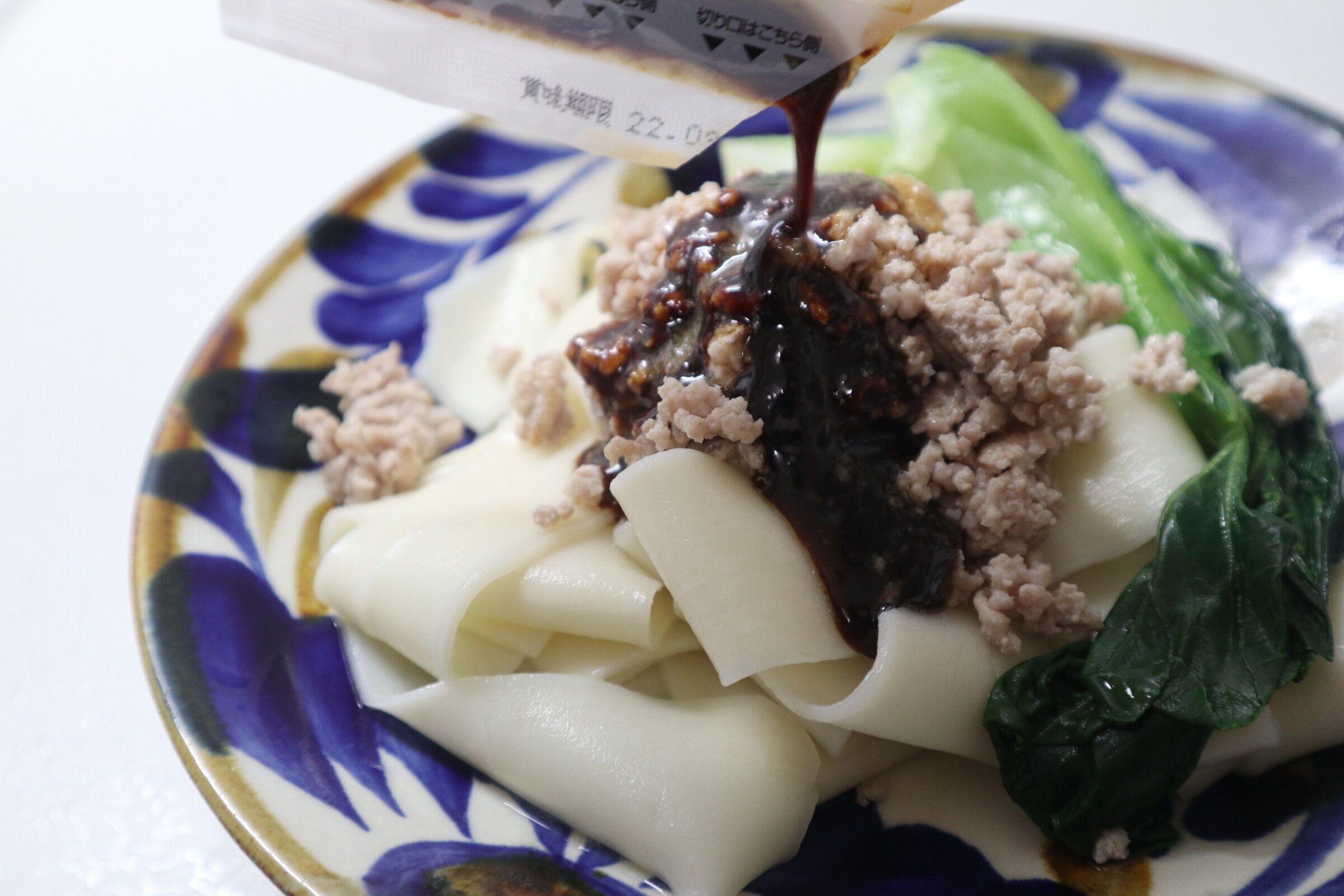 茹でた麺の上に炒めた挽肉(50g程度お好みで)、茹でた青梗菜(1株を半分に切る)をトッピングして、上からソースをかける。青梗菜がない場合は、小葱やほうれん草、パクチーなどでもおいしいです。