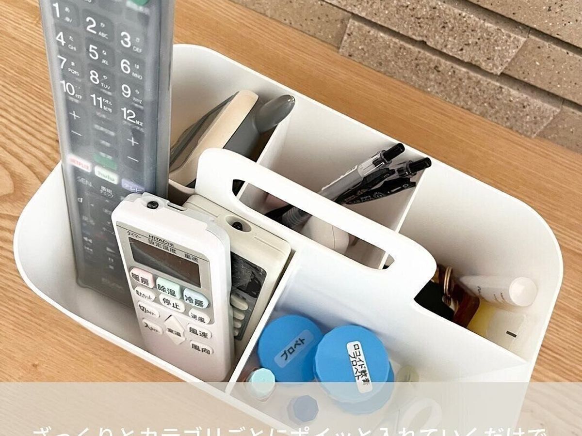 ついついテーブルの上やカウンターの上に置きがちなリモコンやボールペン、塗り薬など。置きっぱなしにしておくとテーブルの上がごちゃつく印象になってしまいますが、「ハコブNインボックス リビング」の中に入れればすっきり!仕切りがあるのでジャンル別に分けることができるのもうれしいですね。