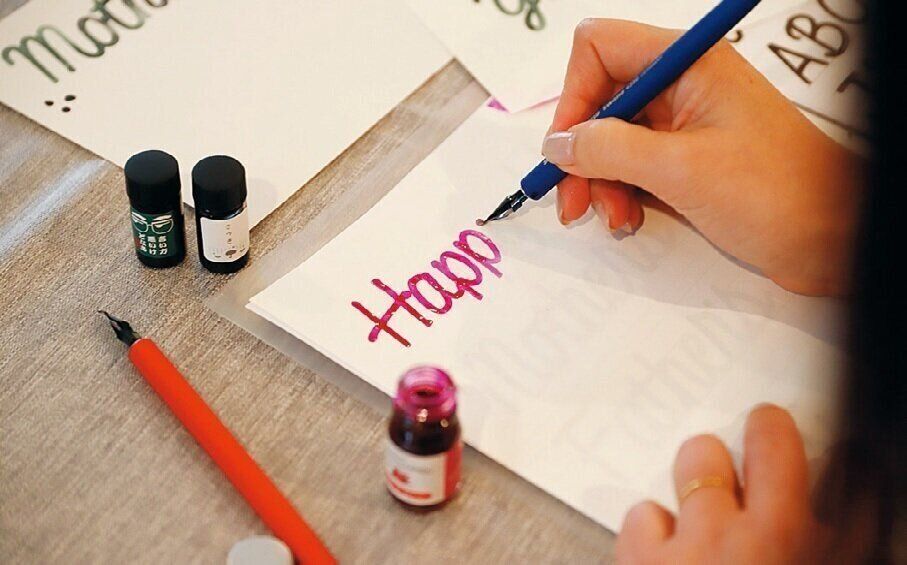 専用のペンに好みのインクをつけて文字を描いていくハンドレタリング。インスタグラムで知ったベチョリさんの本や講座で学んでいます。
