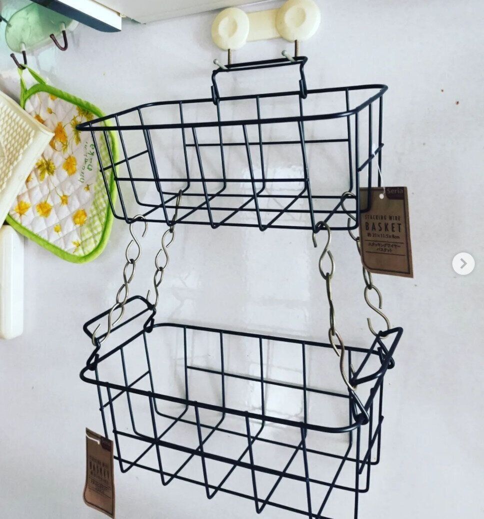 セリアのスタッキングワイヤーバスケットを、チェーンで吊るして2段にするという画期的アイデア。見た目もおしゃれで、キッチンはもちろんどこにでも取り入れやすい活用術です。日用品をざっくり入れてもスッキリ見えますし、フェイクグリーンや雑貨を入れても素敵ですね。