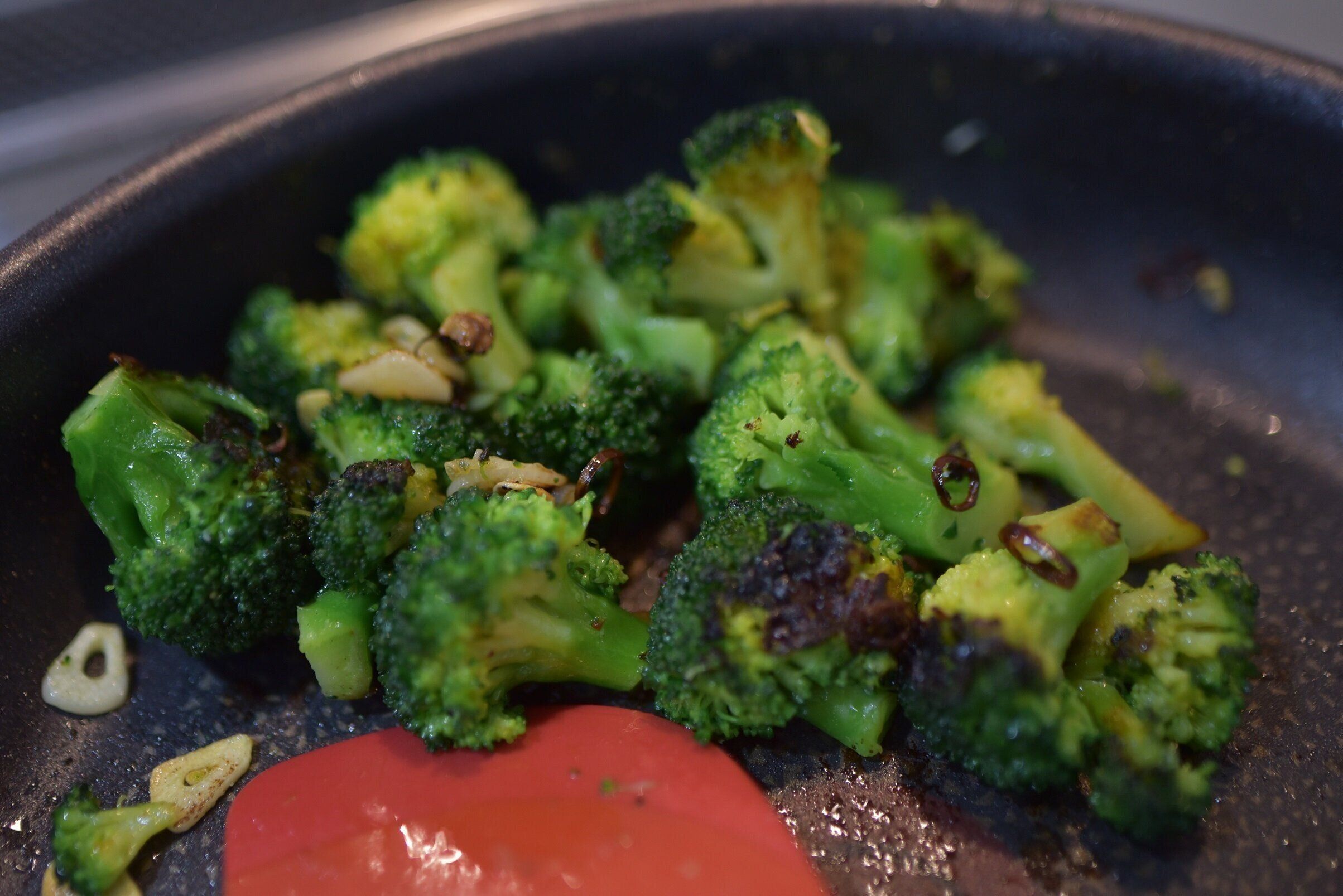 ブロッコリーは、さっと炒めるというよりは、焼き色をつけるくらいじっくりと加熱したほうがよいようです。しっかり水分をとばしたほうが、水っぽい食感がなくなりました。