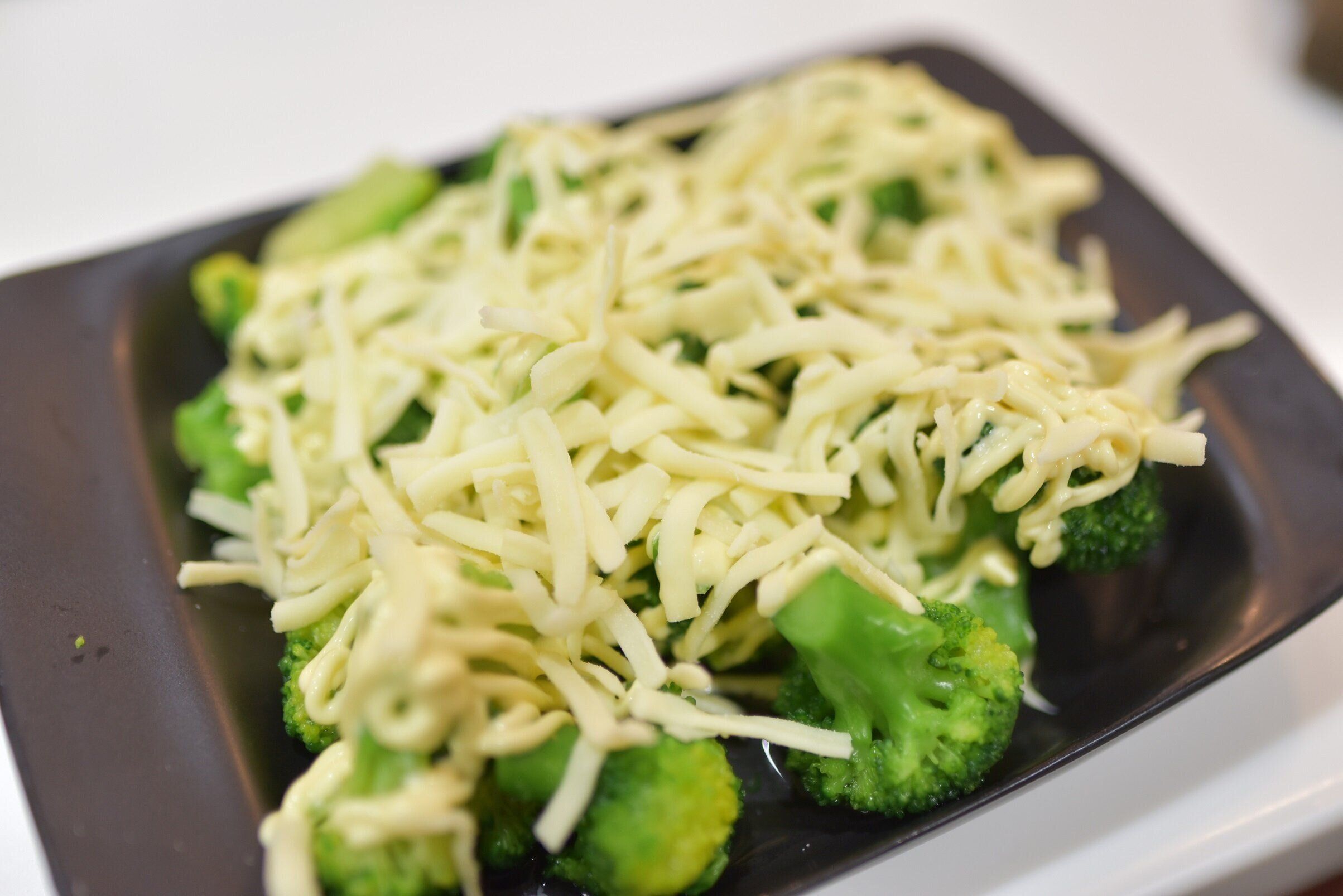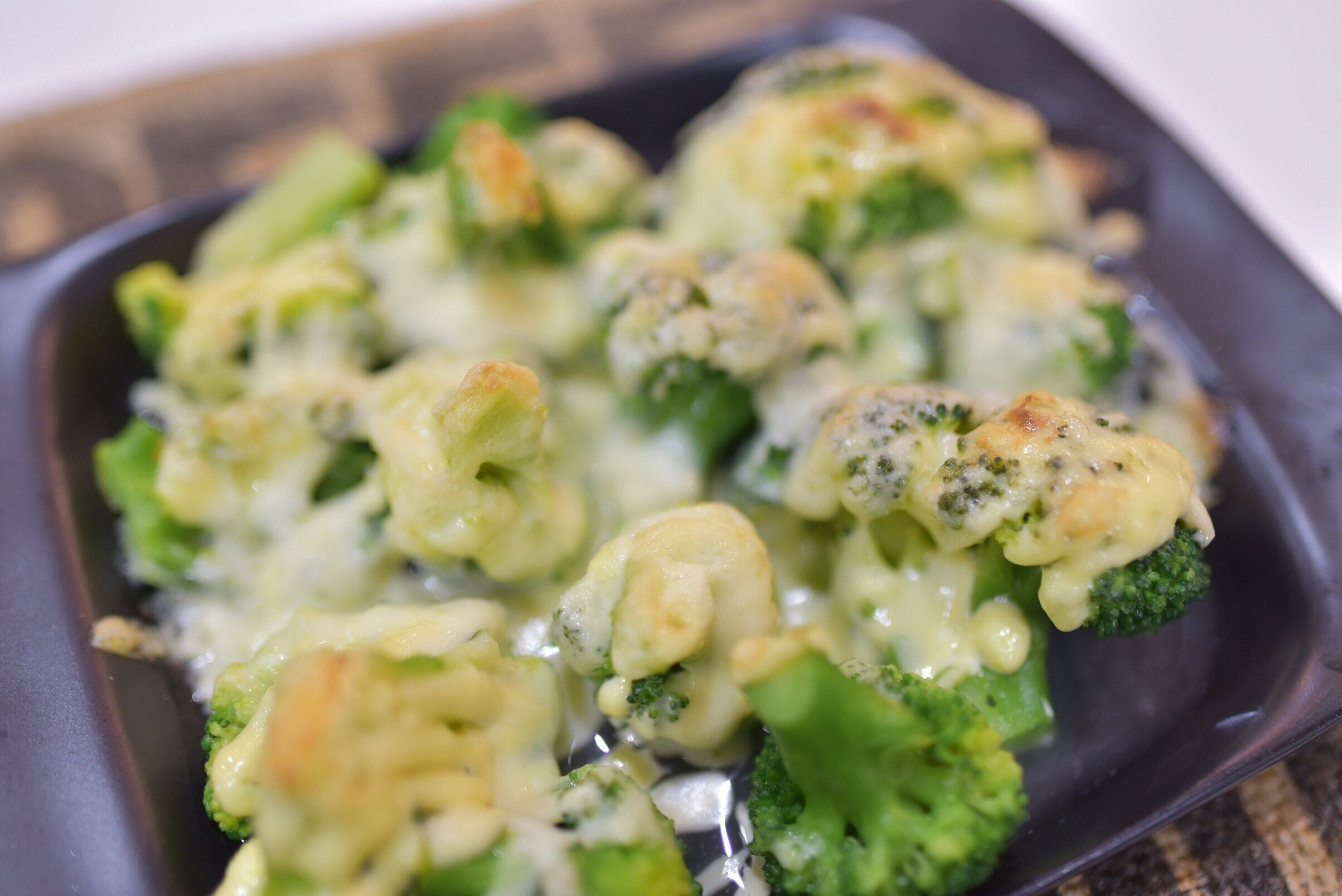 200gのブロッコリーを500Wで3分。ラップをかけずに加熱し、解凍します。そこにマヨネーズとチーズをのせて、トースターで焦げ目をつけるだけの簡単調理です。