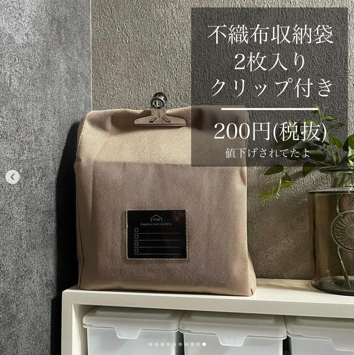 置くだけでサマになる不織布製の収納袋です。クリップつきで、のぞかれたくないものもしっかり隠せます。トイレに置いてサニタリー用品を入れたり、トイレットペーパーを入れたり、リビングに置いて雑貨の一時的な隠し場所にしたり、いろいろ使えそうです。