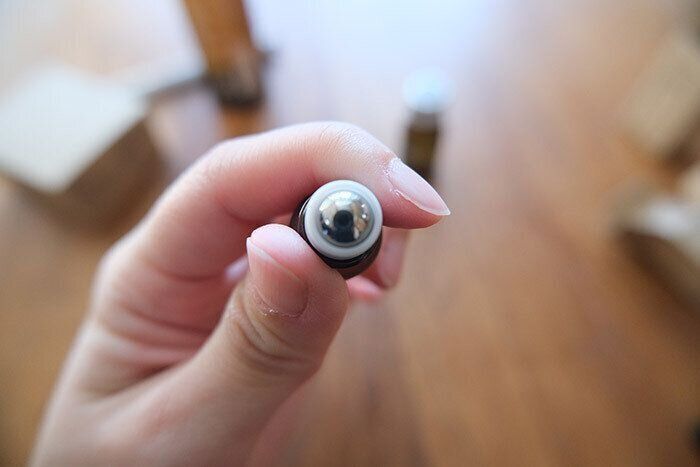 蓋を開けるとパチンコ玉みたいなものが。これを手首なんかで転がすとすっきりとした香りがただよってくれます。目を覚ましたいときなんかにもお手軽でいいです!