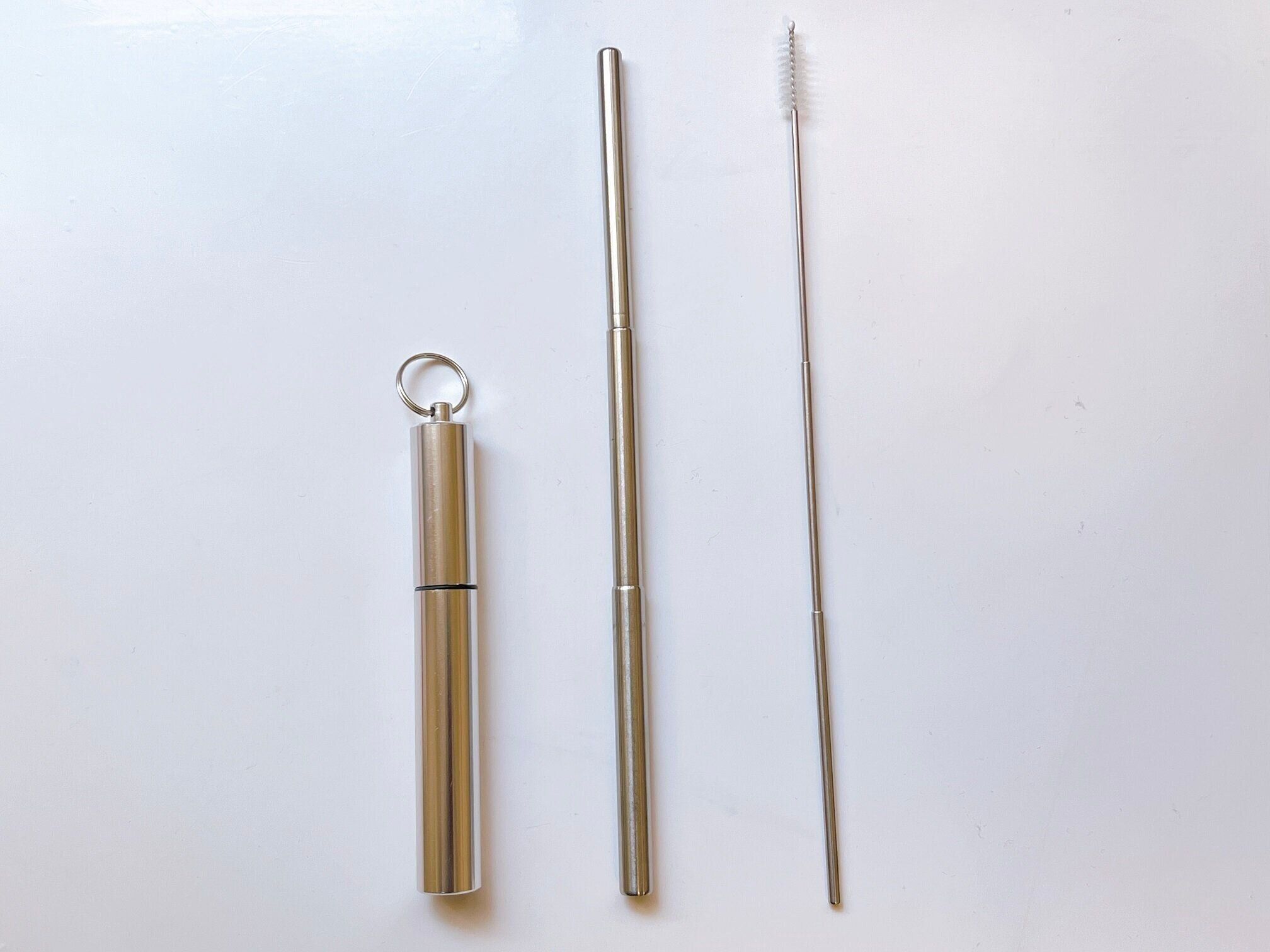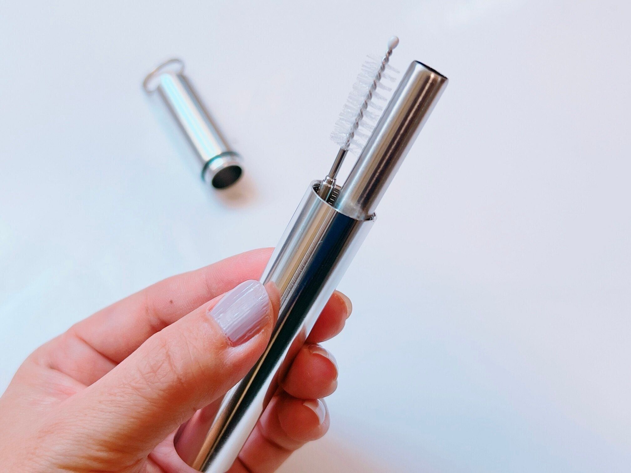 中央にあるのが、伸縮して持ち運びにも便利なステンレスストロー。写真では伸ばしている状態ですが、縮めればケースの中にコンパクトに収納できます。隣にあるブラシも同様に伸縮する仕様。もちろん、洗って再利用できる便利なエコグッズです。