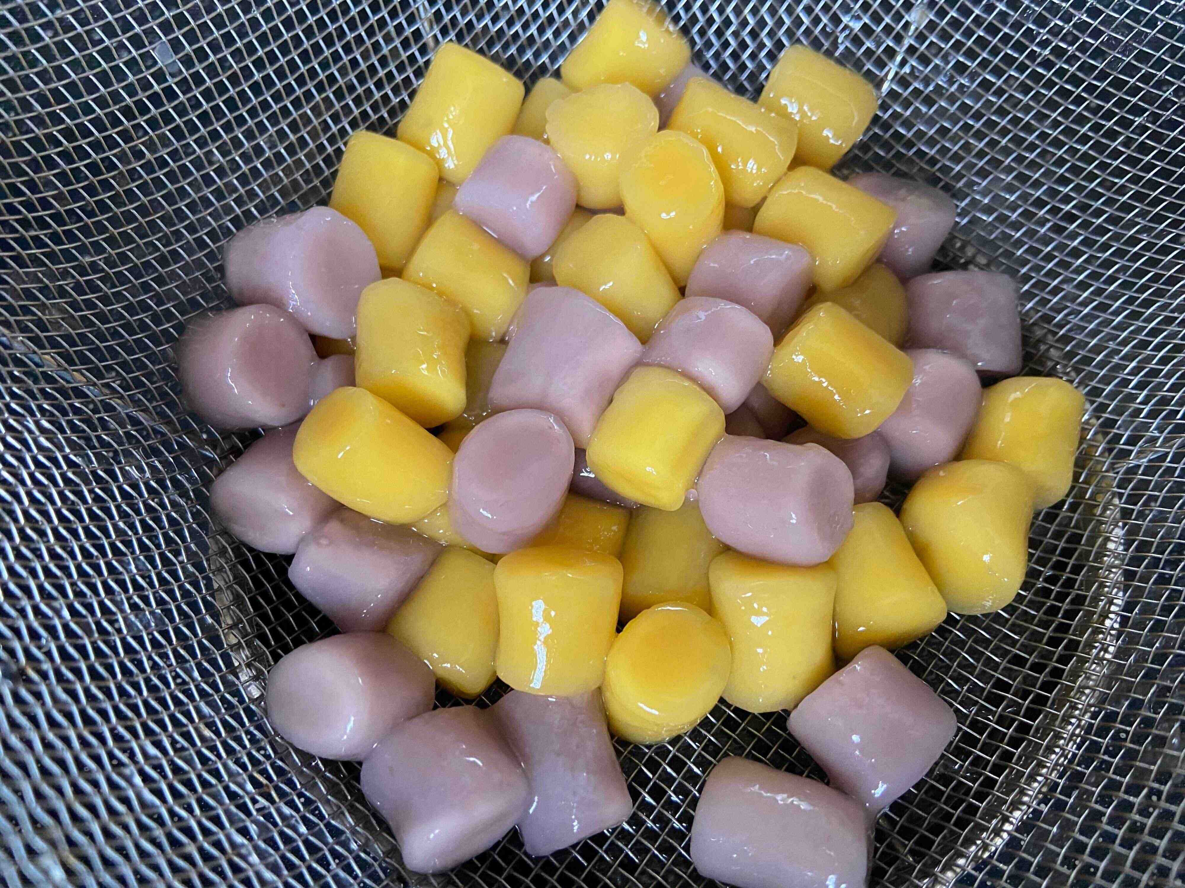 ゆでて冷水でしめた「芋圓」は、色がくっきりときれいに出て鮮やかな見た目に。