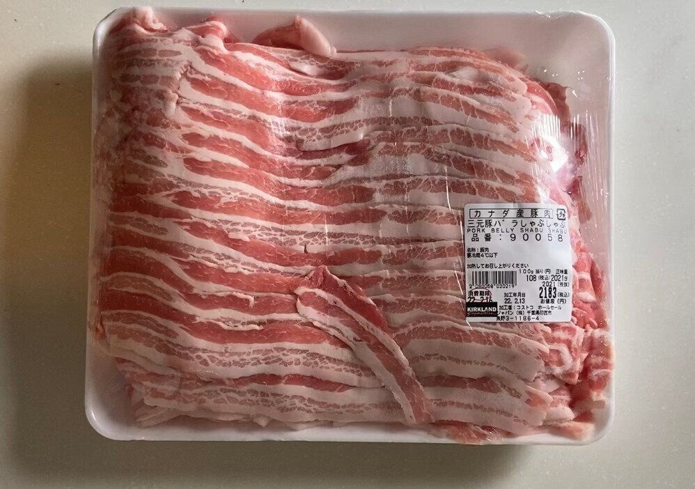 こちらがコストコに数あるお肉の中で筆者が一番リピートしている商品「カナダ産三元豚バラしゃぶしゃぶ」(購入時:2,183円)です。
