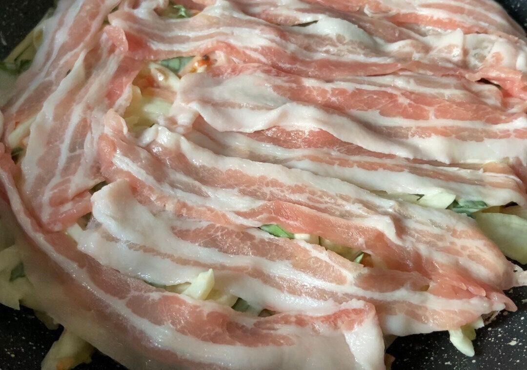 ニラと玉ねぎをたっぷり入れた生地をフライパンで焼き、お好み焼きのように豚バラを並べてひっくり返して焼きます。