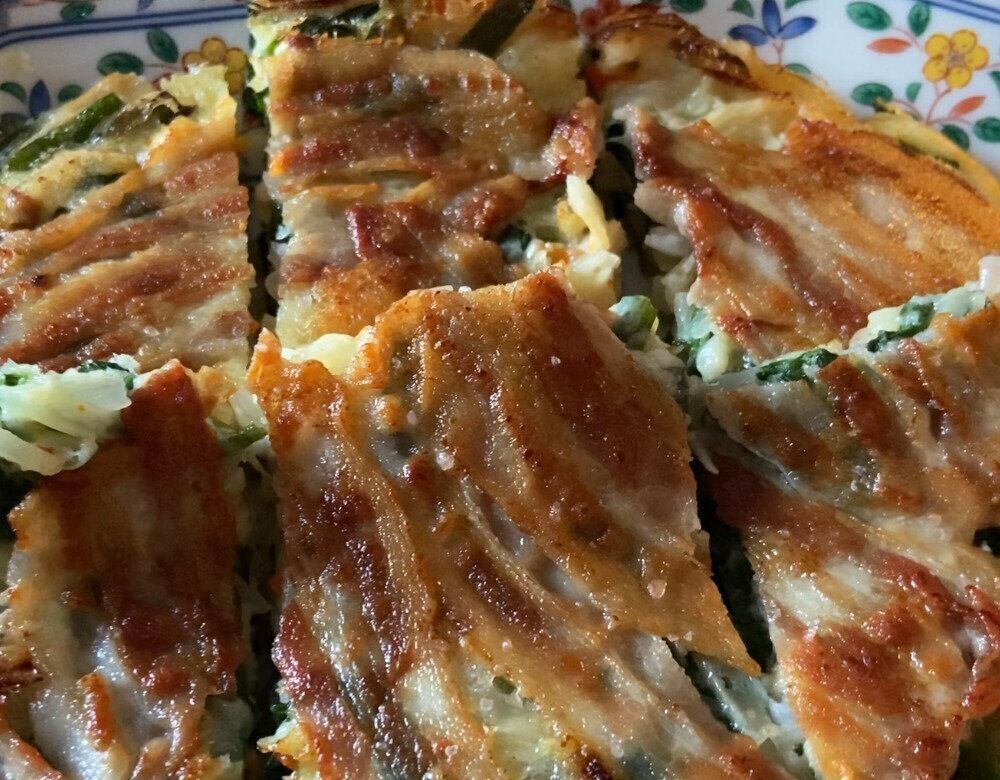 カリカリに焼いた豚バラは食欲がわいてくるおいしそうな見た目に!味ももちろんとってもおいしくて野菜だけのチヂミよりも子どもたちの食いつきがよく、ボリュームもUPするのでおすすめ。