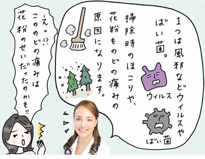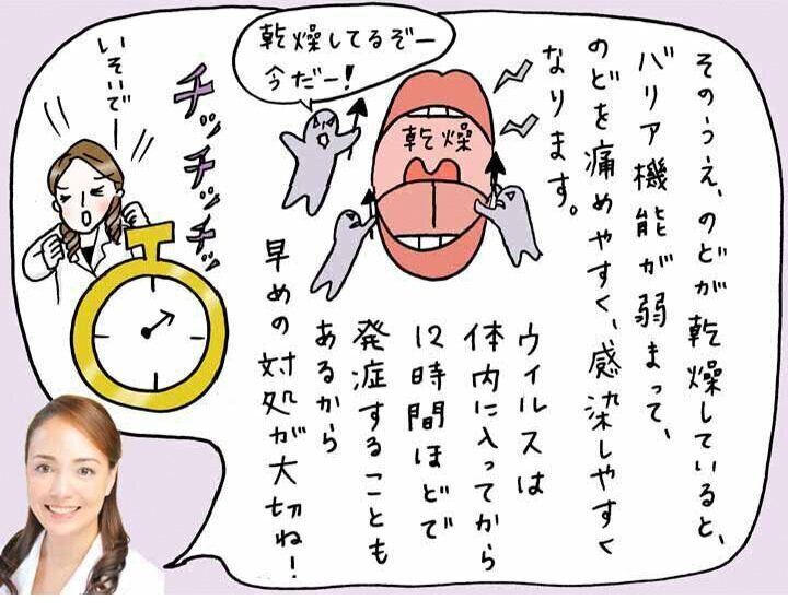 石原先生によると、のどの痛みの原因は風邪などのウイルスのほか、ほこりや花粉などさまざま。だから、バタバタしがちな新年度はのどの痛みを起こしやすい時期ともいえます。さらに乾燥すると、ウイルスやばい菌の体内への侵入を妨げてくれるのどの粘膜がうるおいをなくし、感染しやすい状態に。体内に入ったウイルスは増殖し、ウイルスによっても異なりますが、インフルエンザなどは12時間で発症に至るというケースも。