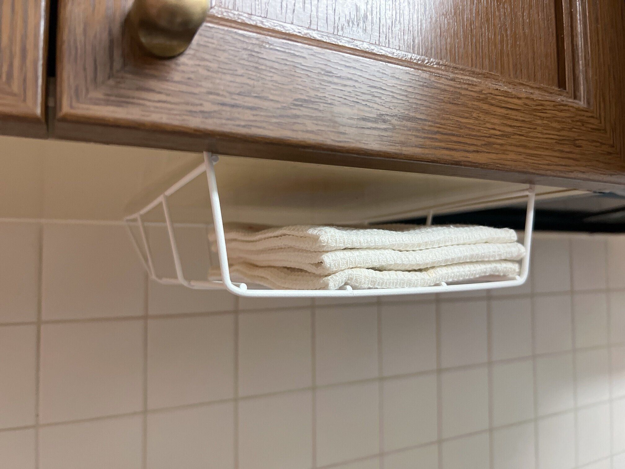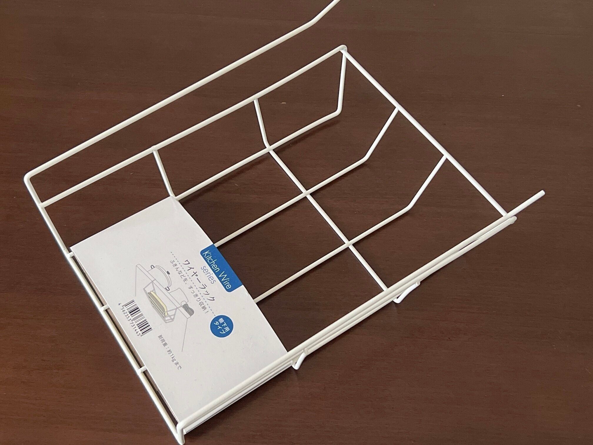 セリアで購入した、キッチンの棚下用の「ワイヤーラック」。ふきんなどをすっきり収納できるアイテムです。サイズは高さ約8cm×奥行約25.5cm×幅約16cmで、耐荷重は約1kgまで。価格は110円です。