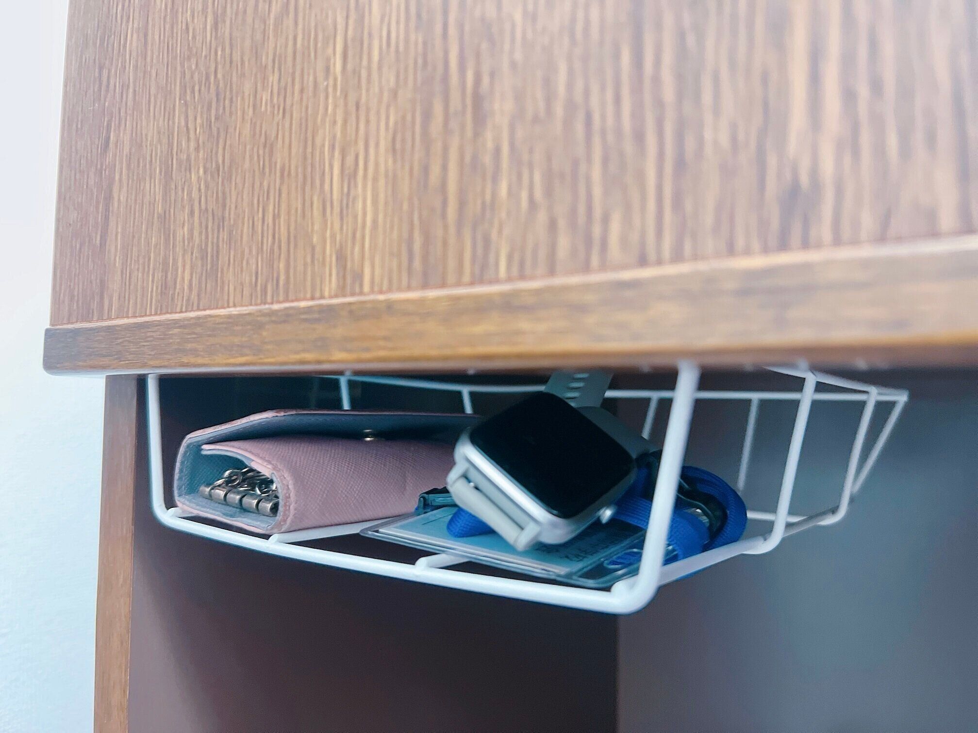 玄関の棚にラックを取りつけ、外出時に必要な鍵や時計、パスなどの定位置と決めると、忘れることもなくなるし、帰宅後の片づけも楽です。
