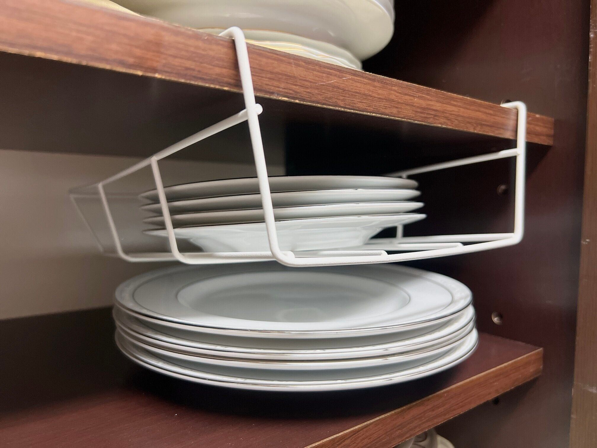食器棚や本棚の空間にも収納スペースが生まれます。ディッシュラックとして使うと、重ねていたお皿も取り出しやすくなります。カラーボックスにもぴったり取りつけられて便利!