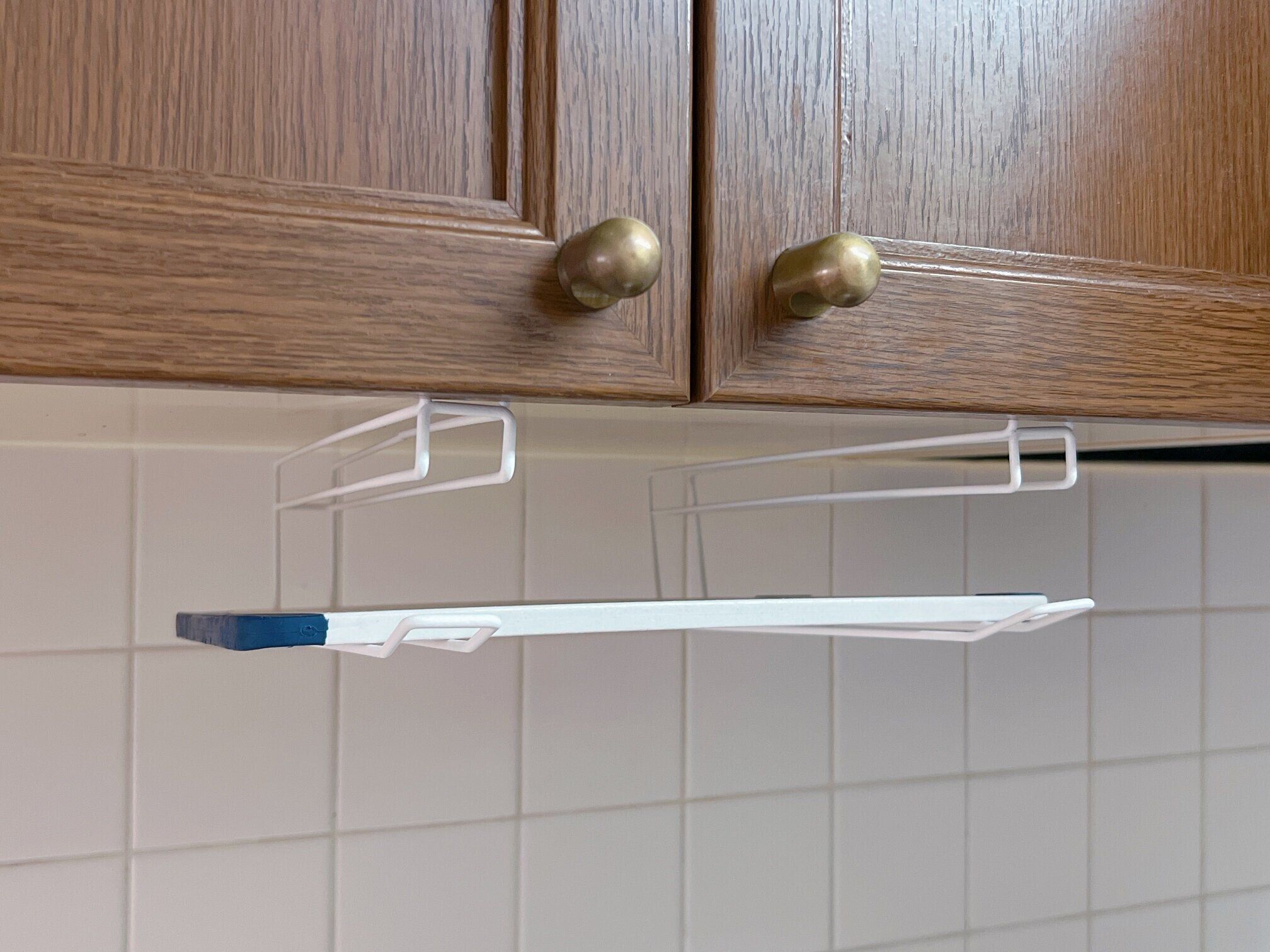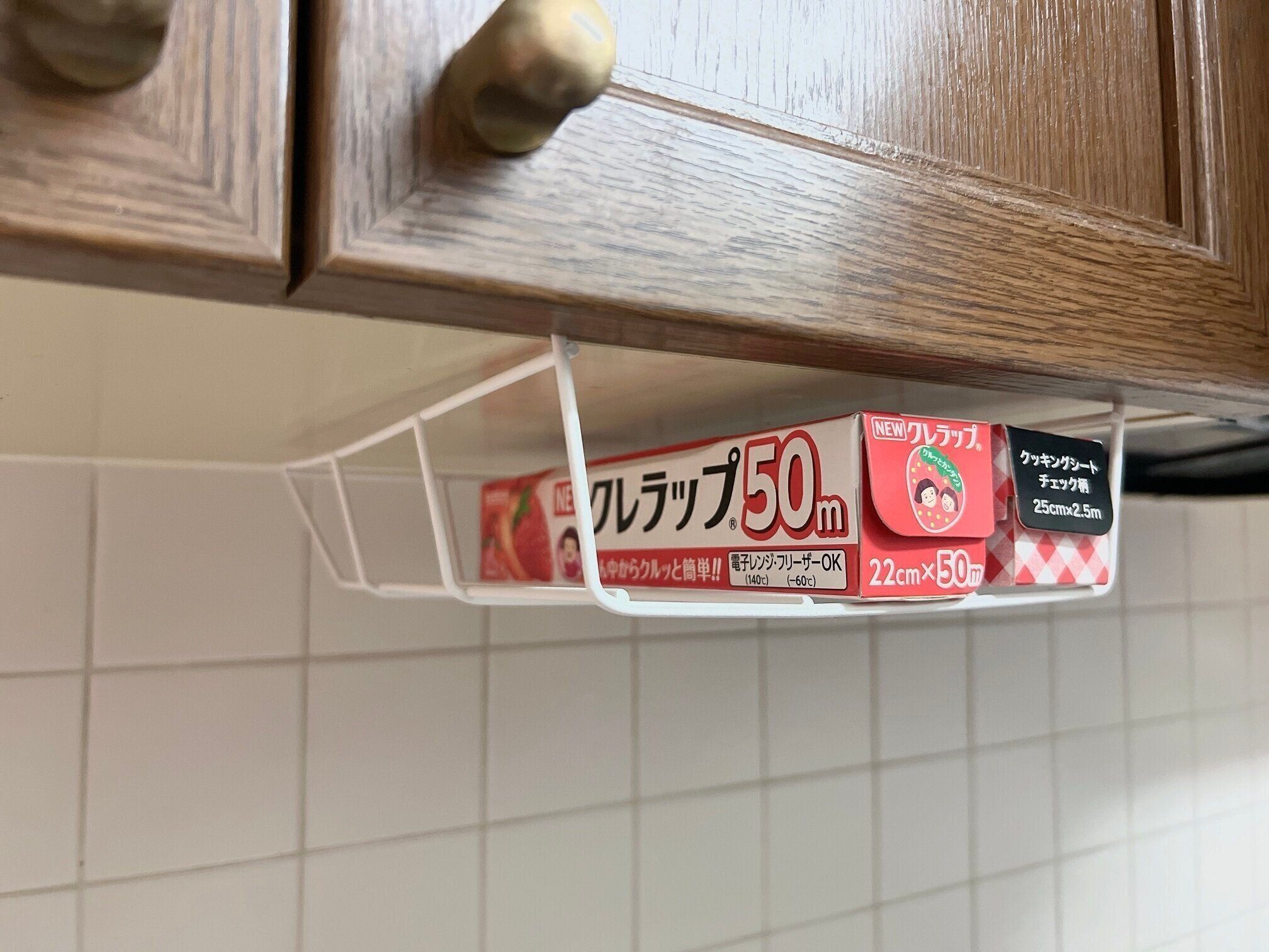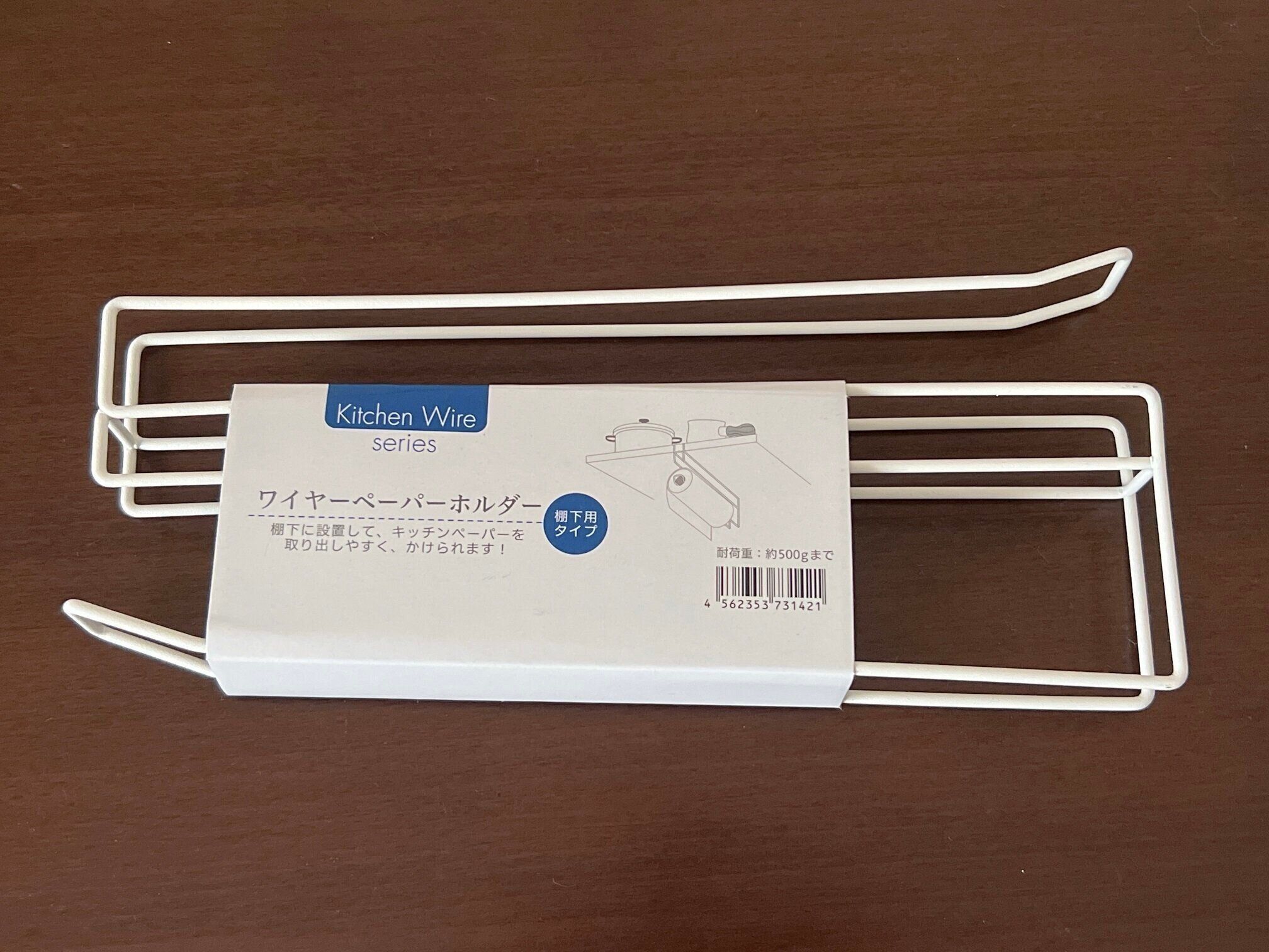 続いてご紹介する「ワイヤーペーパーホルダー」も棚下用タイプ。棚下に設置して、キッチンペーパーを取り出しやすくかけられます。サイズは奥行約25.5cm×高さ約9cmで、耐荷重は約500gまで。棚板の厚み2.5cmまで対応しています。価格は110円。