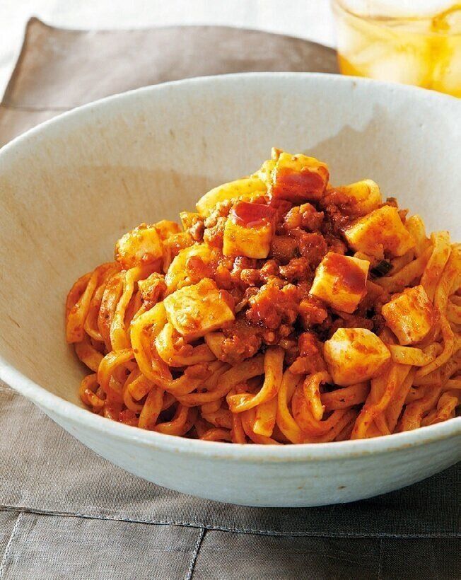 店舗では味わえないオリジナルメニューで、平打ち中華麺に、肉みそ、豆腐、にら入り。ピリッとしびれる花椒(ホワジャオ)入り辣油がたまらないうまさ。
